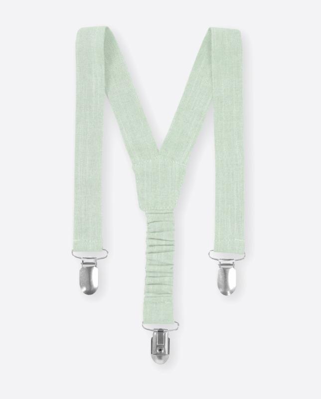 Prácticos tirantes para niño confeccionados en lino de color verde agua con una zona elástica y pinzas de metal. FABRICADOS EN ESPAÑA.