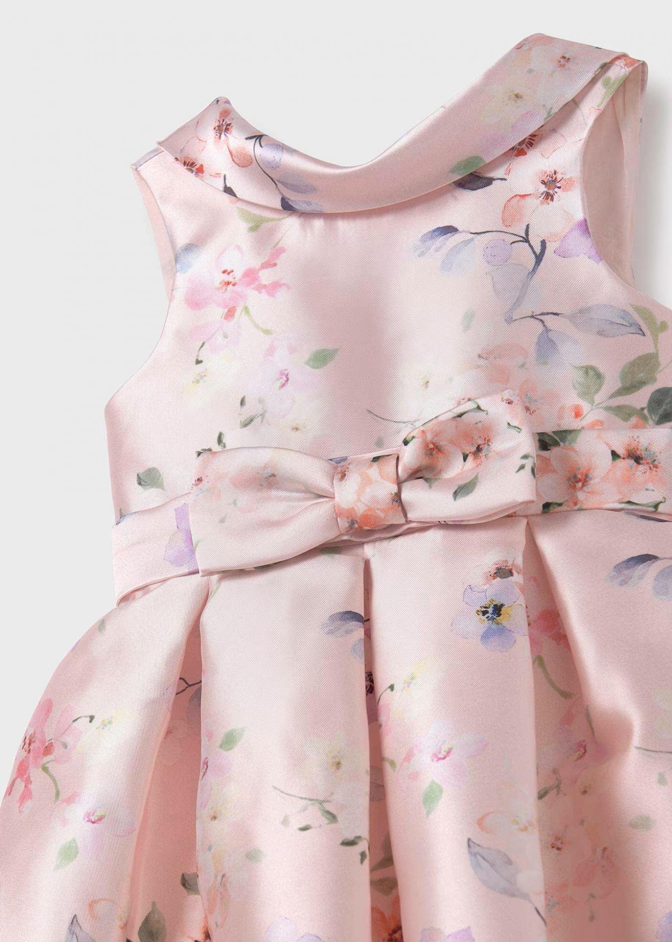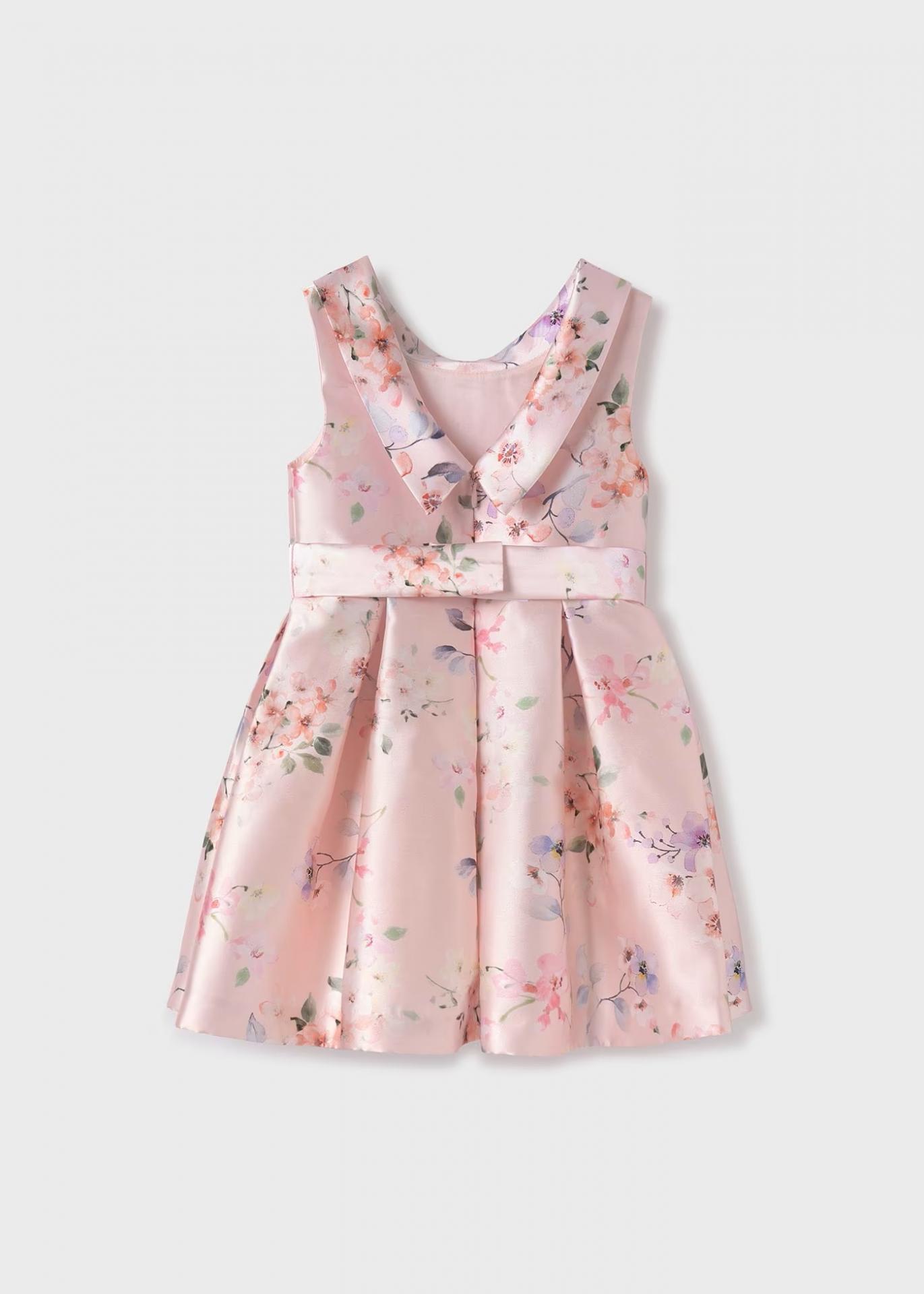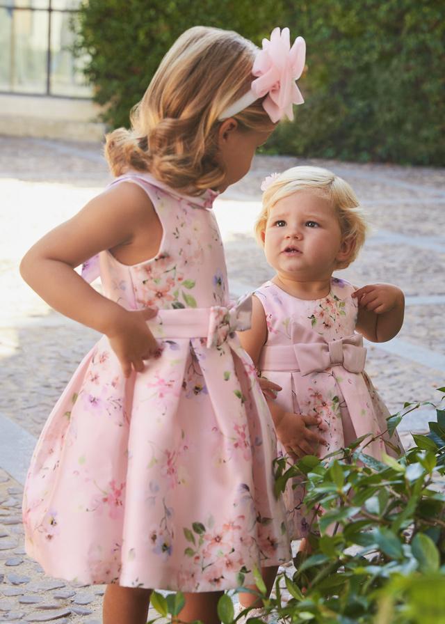 Nuevo vestido de ceremonia para niña de la nueva colección de primavera verano 2025 de la firma española Abel y Lula, confeccionado en tejido estampado de mikado en color rosa de flores con aplique decorativo en el talle.