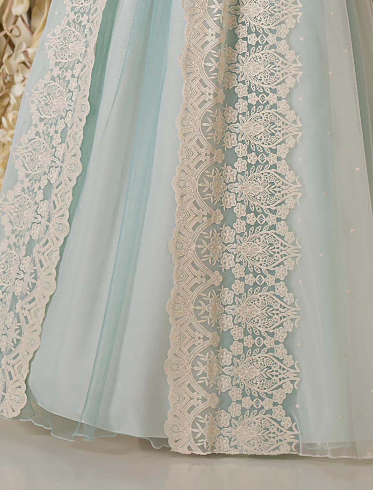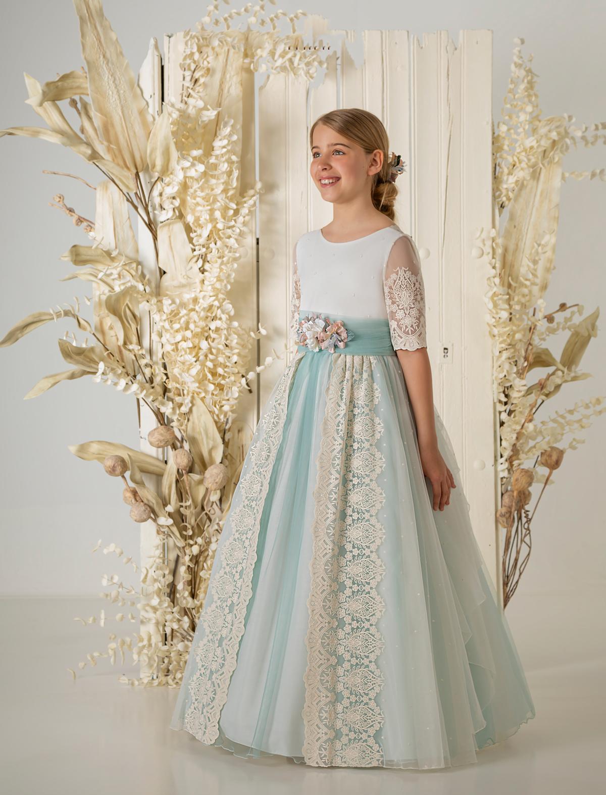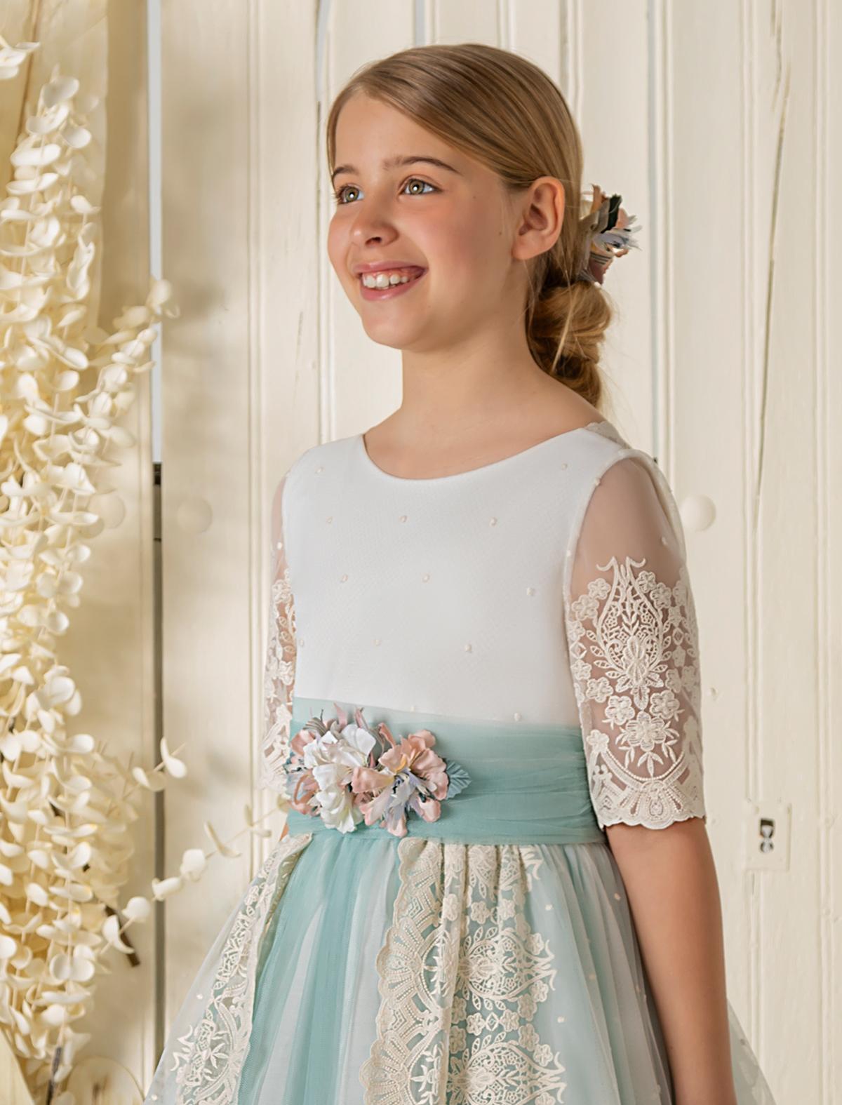 Vestido de comunión premium de la nueva colección 2026 de la firma Aire Barcelona Comunión, modelo A866 de manga francesa confeccionado con tul bordado de alta calidad combinado con tul en color verde menta.