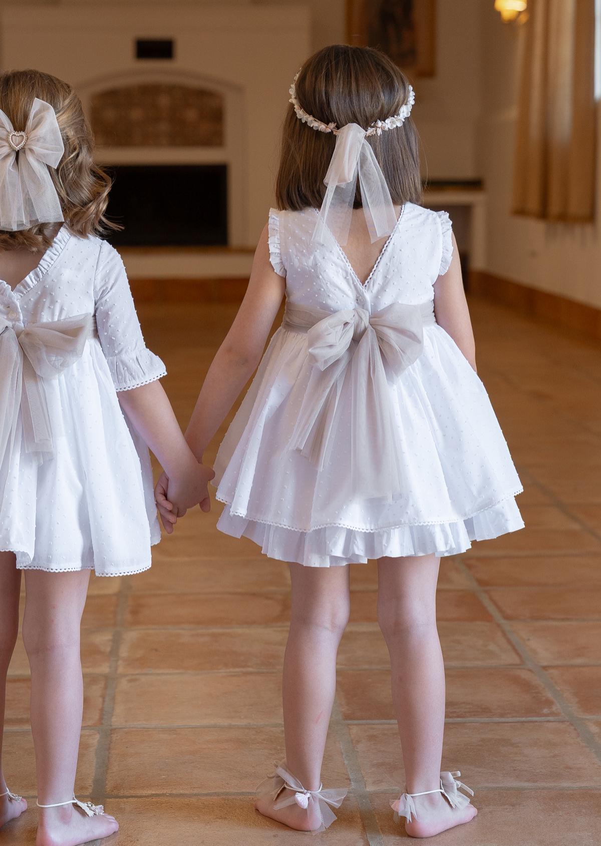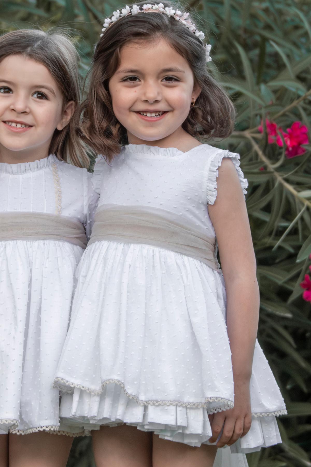 Vestido para ceremonia y arras de niña de la nueva colección de la firma española Eva Martínez Artesanía 2025, modelo 40711 de la familia Jolie, en el largo CBG lleva incluida la braguita, confeccionado en plumeti sin mangas con fajín de tul a contraste. FABRICADO EN ESPAÑA. Medidas en la Descripcion.