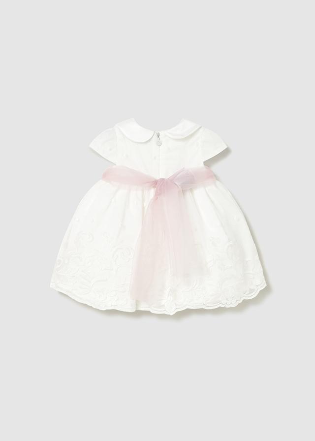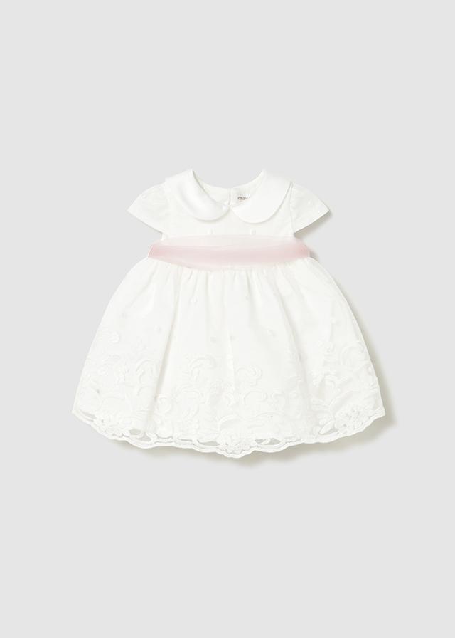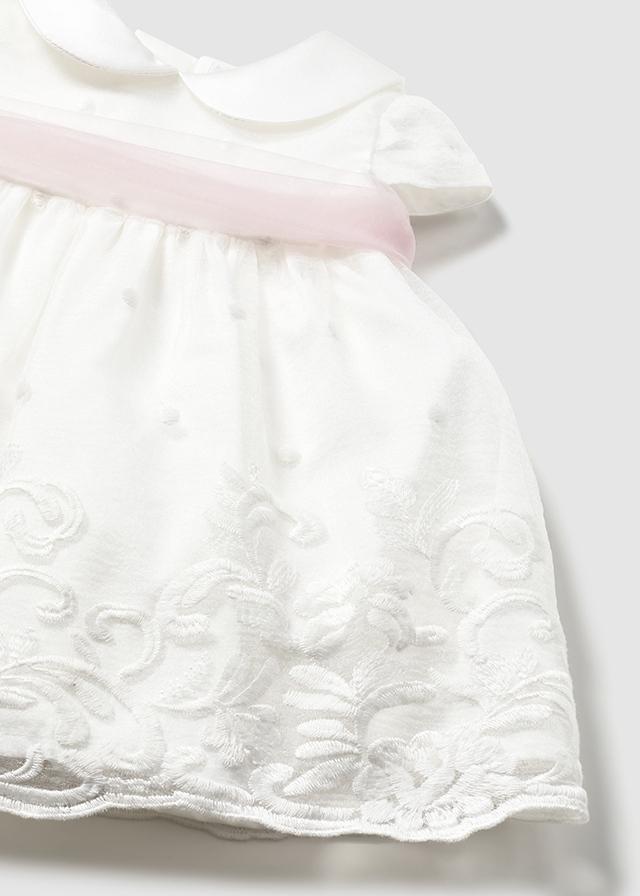 Especular y económico vestido de bautizo para bebe de la nueva colección de primavera verano 2026 de Mayoral newborn, confeccionado en tejido de tul bordado con fajín a contraste de color de tul liso.