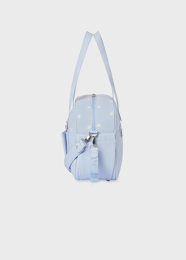 Muy practico bolso de Mayoral de Puericultura que por su color neutro es perfecto tanto para niño como para niña, confeccionado en polipiel de color celeste, y estampado con pequeñas estrellas.