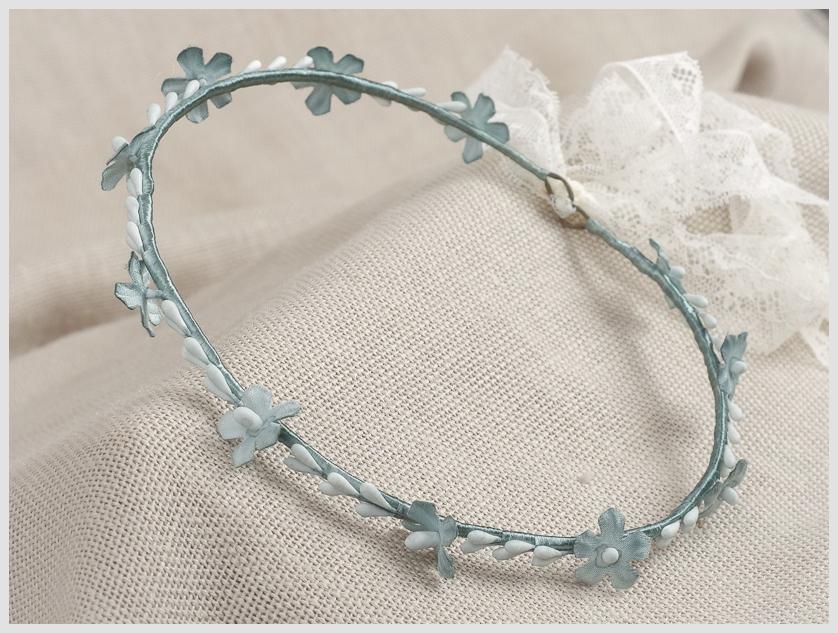 Espectacular corona de flores pequeñas para niña en tono verde agua con cierre mediante blonda, con pequeñas ramitas decorativas, complemento perfecto para los vestidos de Comunión y Ceremonia, fabricada artesanalmente en España. Viene presentada en bonita caja para regalo.