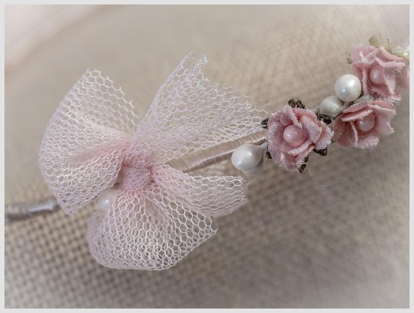 Corona de flores para niña de la nueva colección de Comunión y Ceremonia 20339 de la marca Zoysan, destacan las flores pequeñas de tonos rosa, con perlas en rosas, fabricada de manera artesanal en España. Viene presentada en caja para regalo.