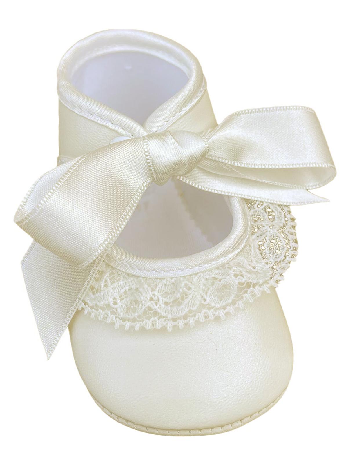 Zapatito para bautizo niña bebe de la marca Cuquitos, modelo 7025, son sin suela dura, fabricado en piel nacarados con puntilla y lazo, son perfecto tanto para bautizo como para cualquier evento. FABRICADO EN ESPAÑA.