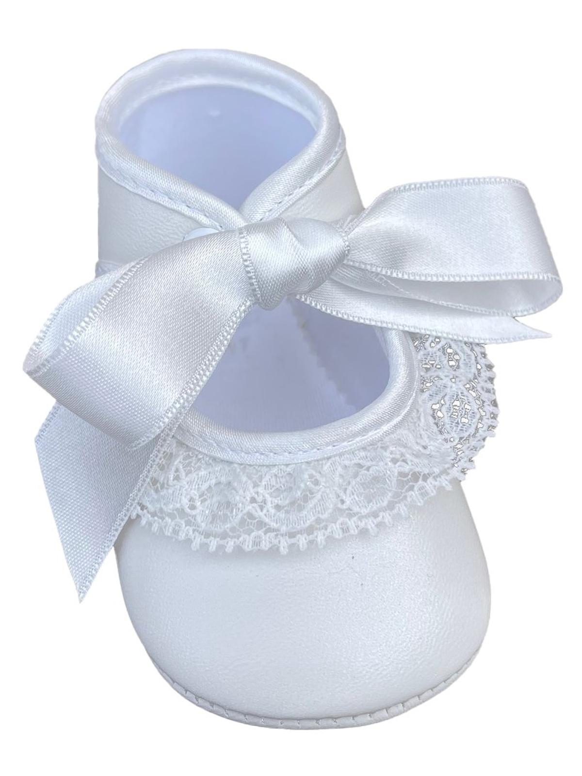 Zapatito niña para bautizo fabricado en piel de alta calidad es un poquito alto, y tiene puntilla decorativa en el empeine un lazo de raso, se ajusta perfectacmente con el su cierre con velcro. FABRICADO EN ESPAÑA.