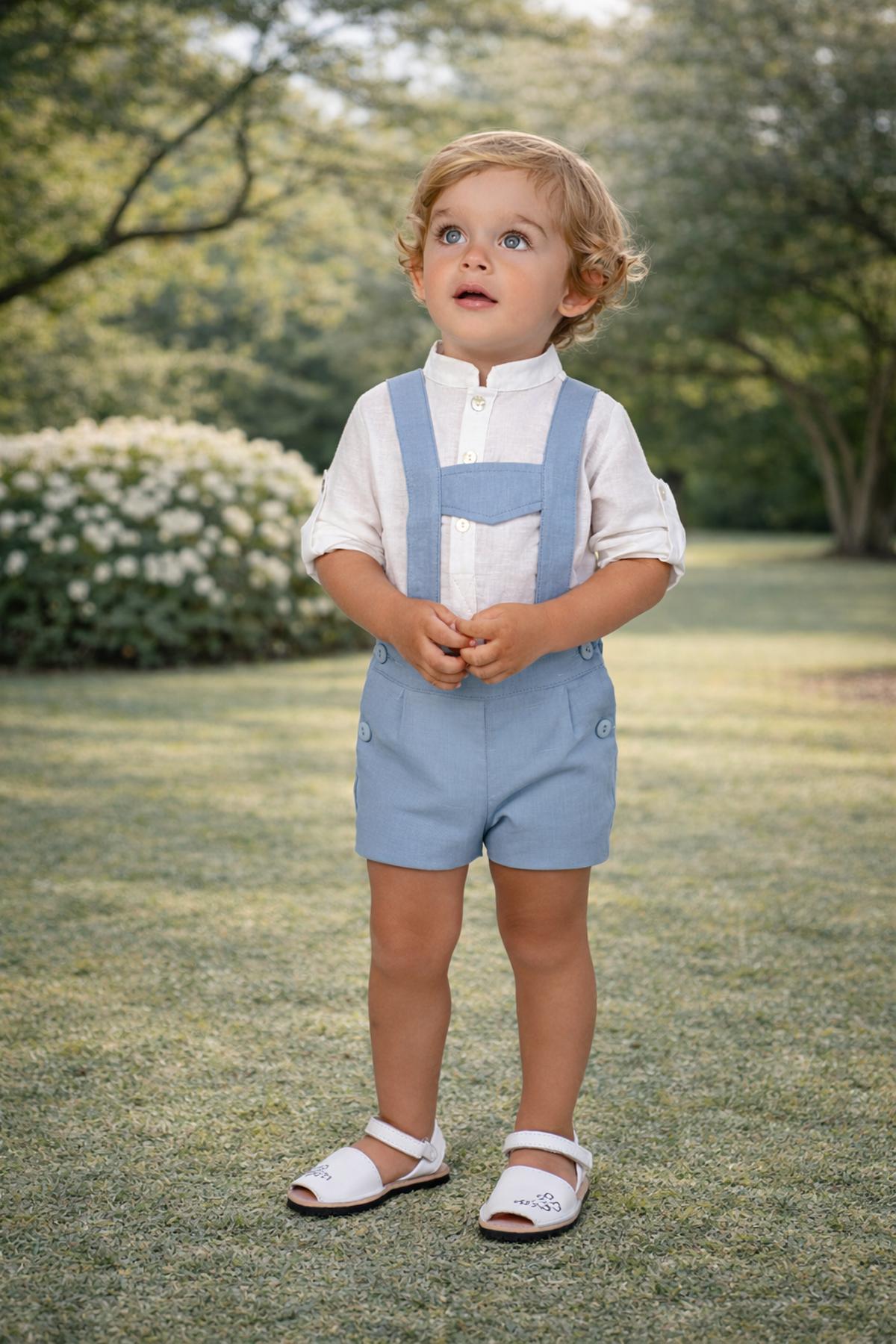 Precioso conjunto de bebe niño de la nueva colección de ceremonia Nekenia para esta primavera verano, compuesto por pantalón peto de lino color azul y camisa de manga larga cuello mao de lino. FABRICADO EN ESPAÑA.