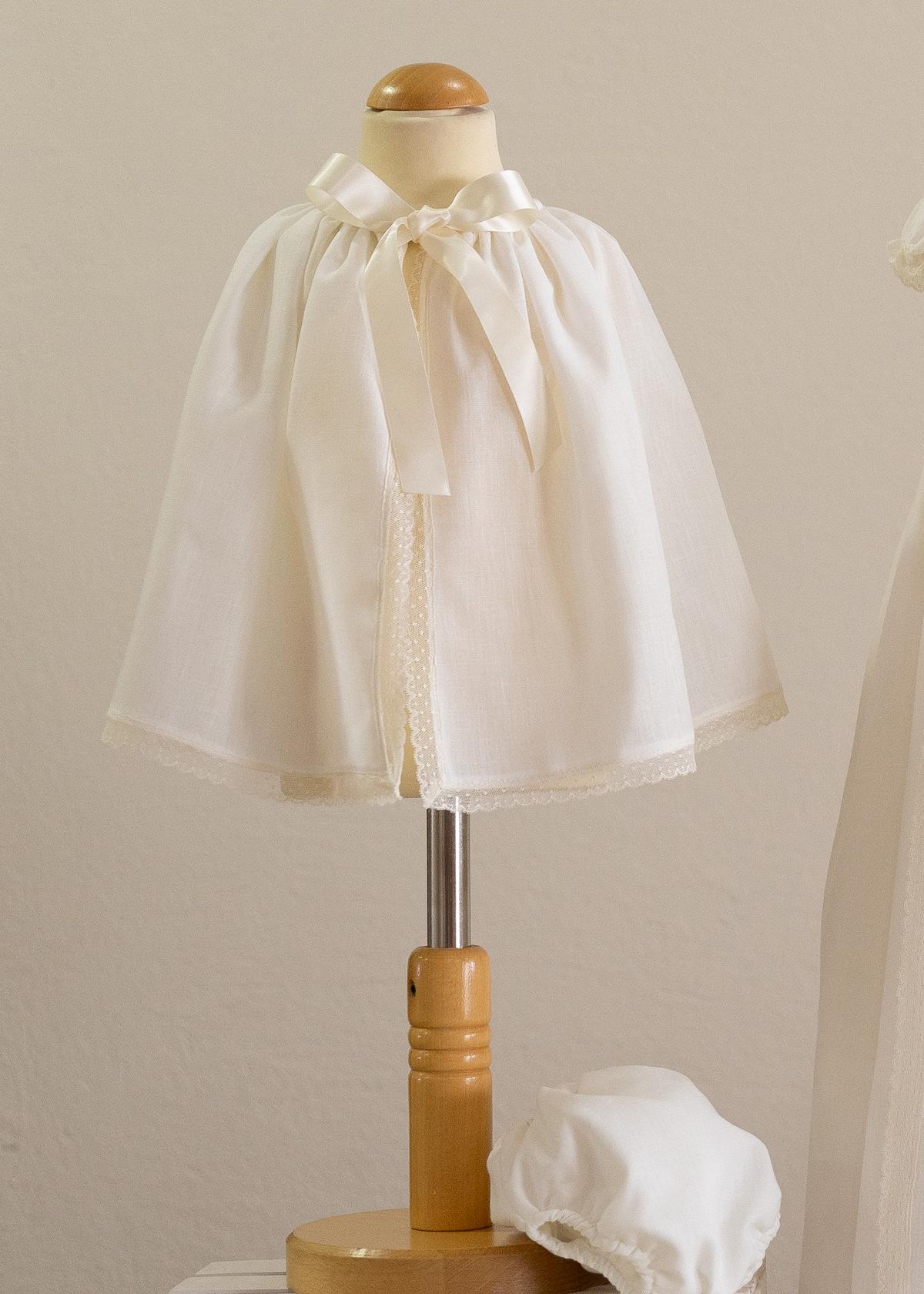 Clásico jesusito para bautizo con braguita, confeccionado en bordado a mano crudo que con una capa interiors e le puede dar el color que se quiera, con lazo decorativo en el pecho, esta fabricado artesanalmente en España, se puede confeccionar con manga larga, manga corta rizada o manga sisa, además de poder añadir capota de manera opcional. Disponible por encargo durante todo el año.
