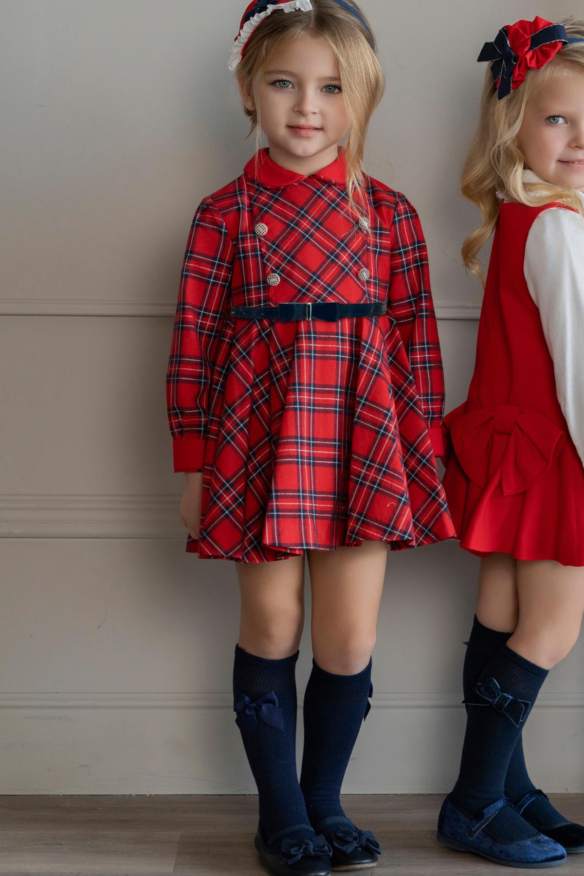 Clásico vestido de niña confeccionado en tejido de cuadros escoceses que por sus colores es precioso para Navidad, tiene dos filas de botones dorados, además lleva un cinturón de polipiel a modo decorativo y que también sirve para entallar el vestido.