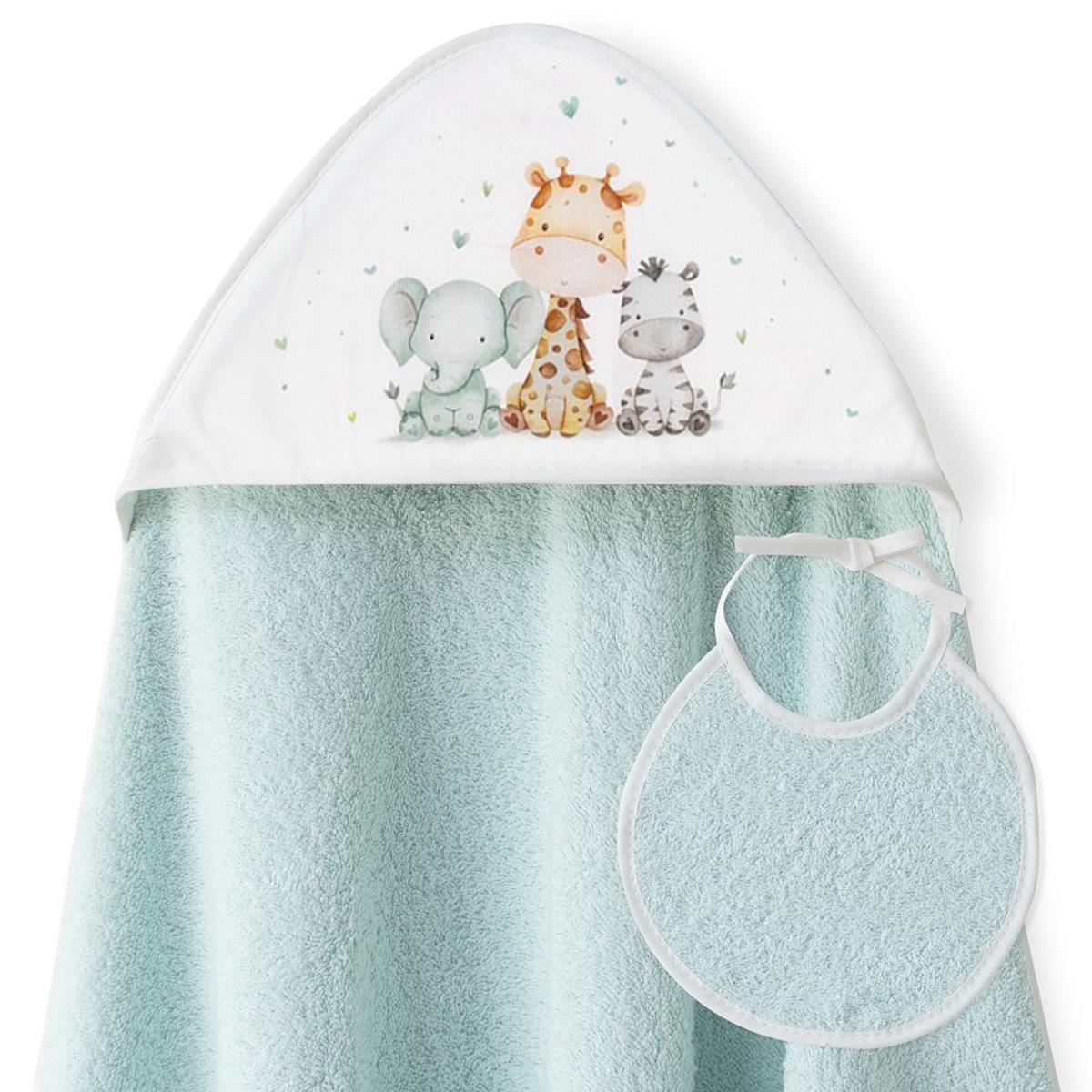 Capa de baño con babero para bebe que puedes encontrar dentro de nuestra sección de puericultura, de tamaño de 1 metro por 1 metro, de color verde agua tiene dibujo en la capucha de tres animalitos FABRICADA EN ESPAÑA.