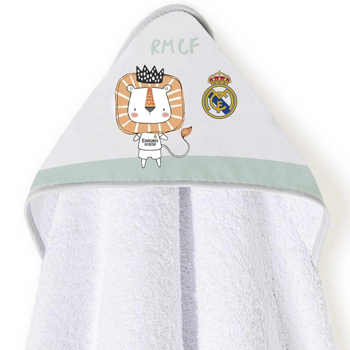 Capa de baño de Real Madrid para bebe que puedes encontrar dentro de nuestra sección de puericultura, de tamaño de 1 metro por 1 metro, tiene dibujo decorativo en la capucha donde destaca el escudo del REAL MADRID. blanca con rosa. FABRICADA EN ESPAÑA.