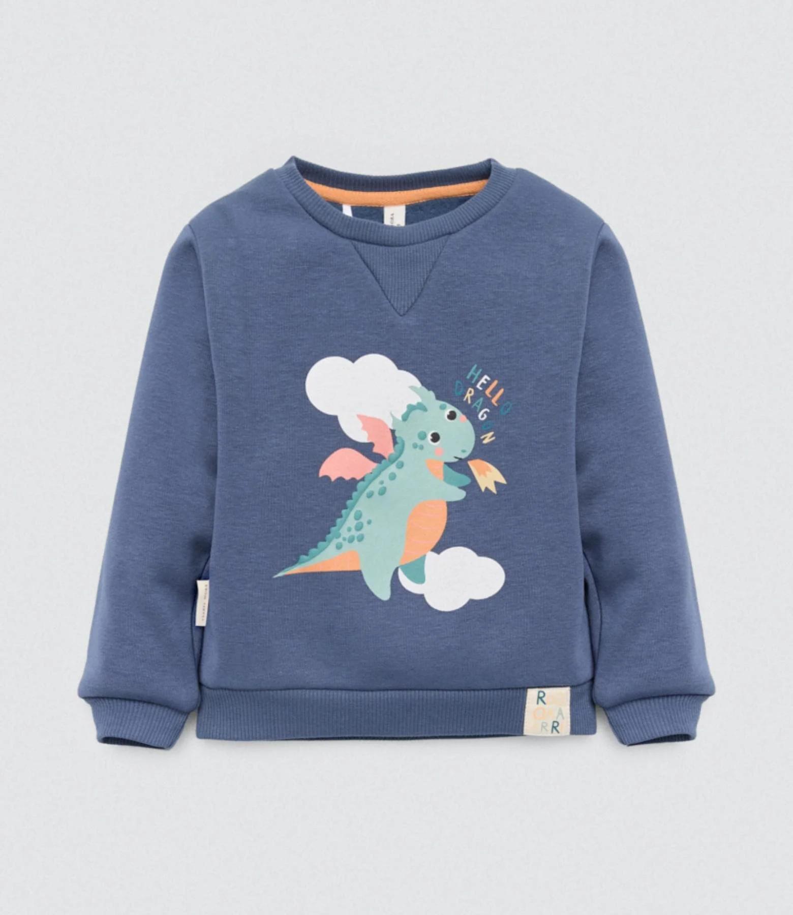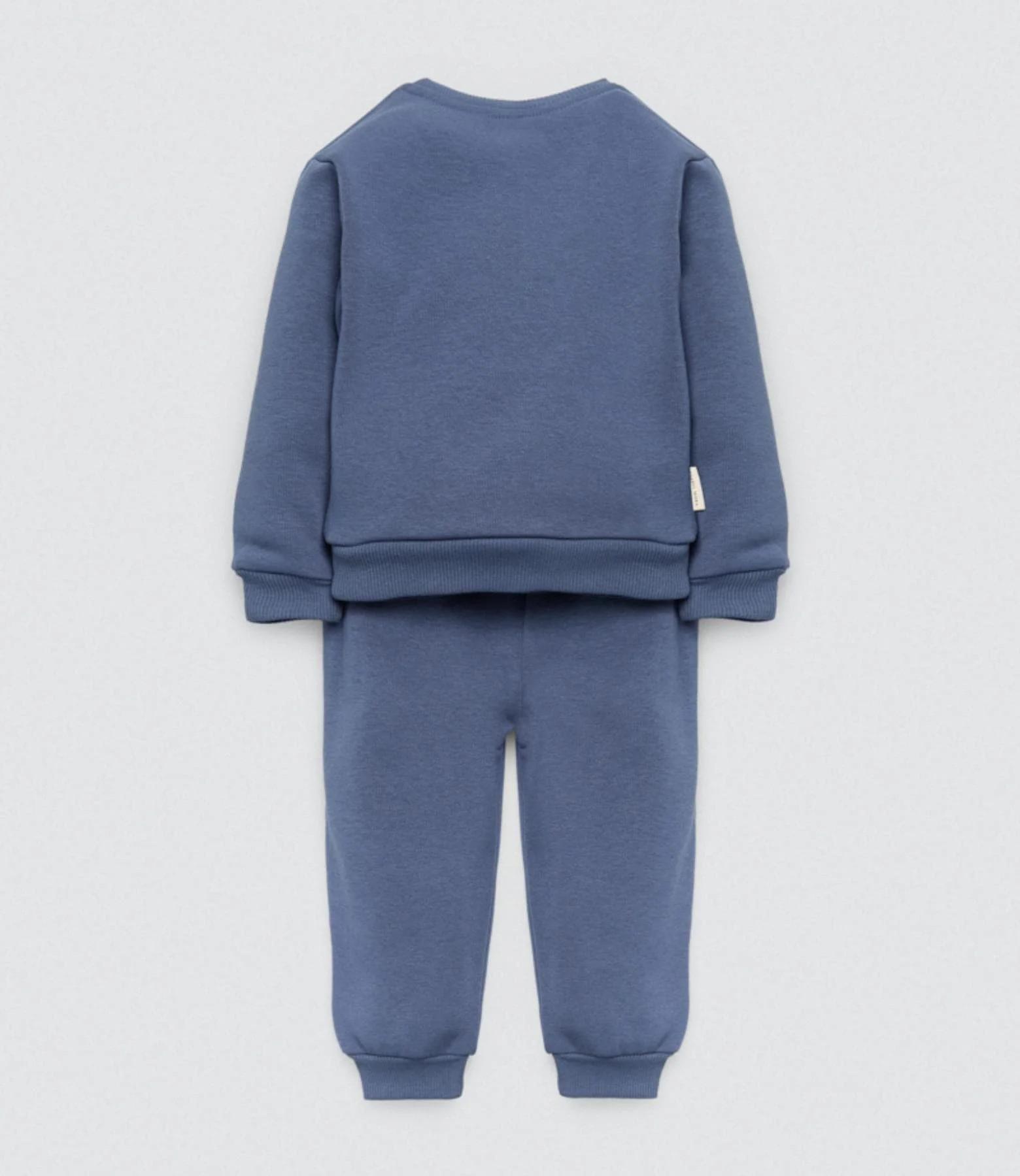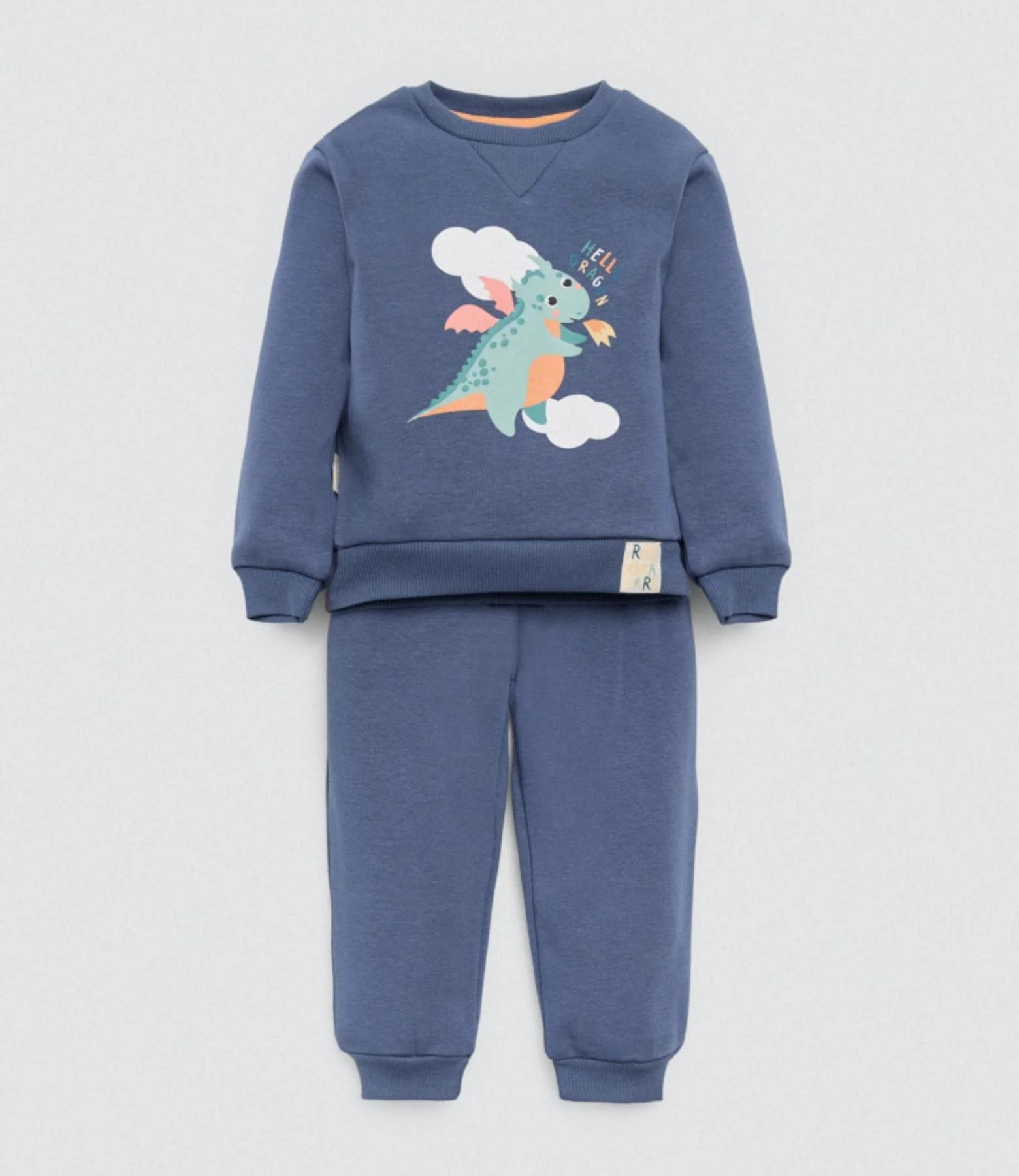 Bonito chándal confeccionado en felpa perchada, tiene el pantalón y la sudadera del al mismo tono, la sudadera es de cuello redondo y tiene un bonito dibujo en el delantero de un dragón, es un chandal perfecto para que nuestro bebe vaya cómodo a la guardería.