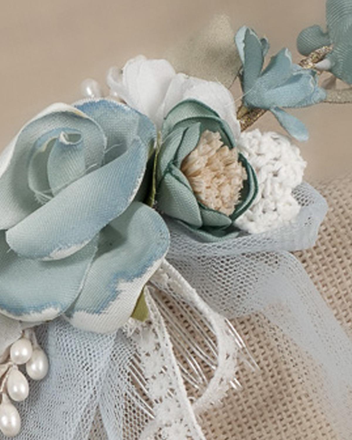 Tocado para niña perfecto tanto para comunión como para ceremonia de la marca española Zoysan, modelo 12773 fabricado manualmente con flores de varios tamaños y colores donde destaca el verde agua. FABRICADO EN ESPAÑA.