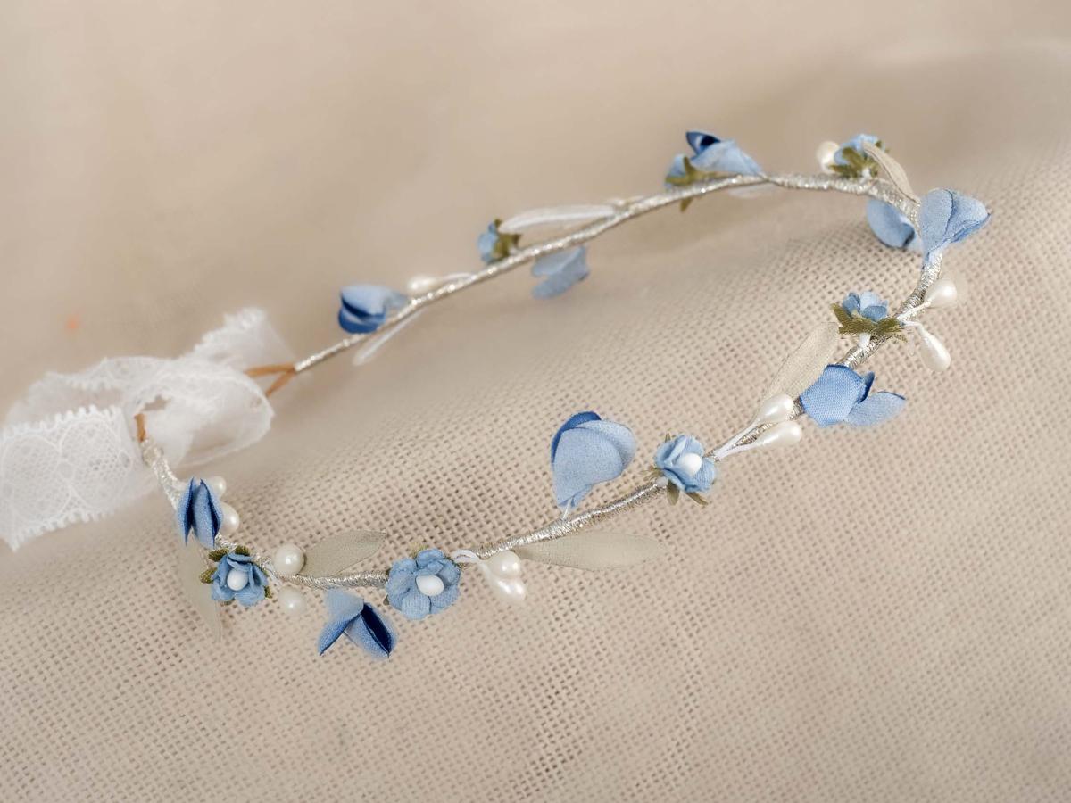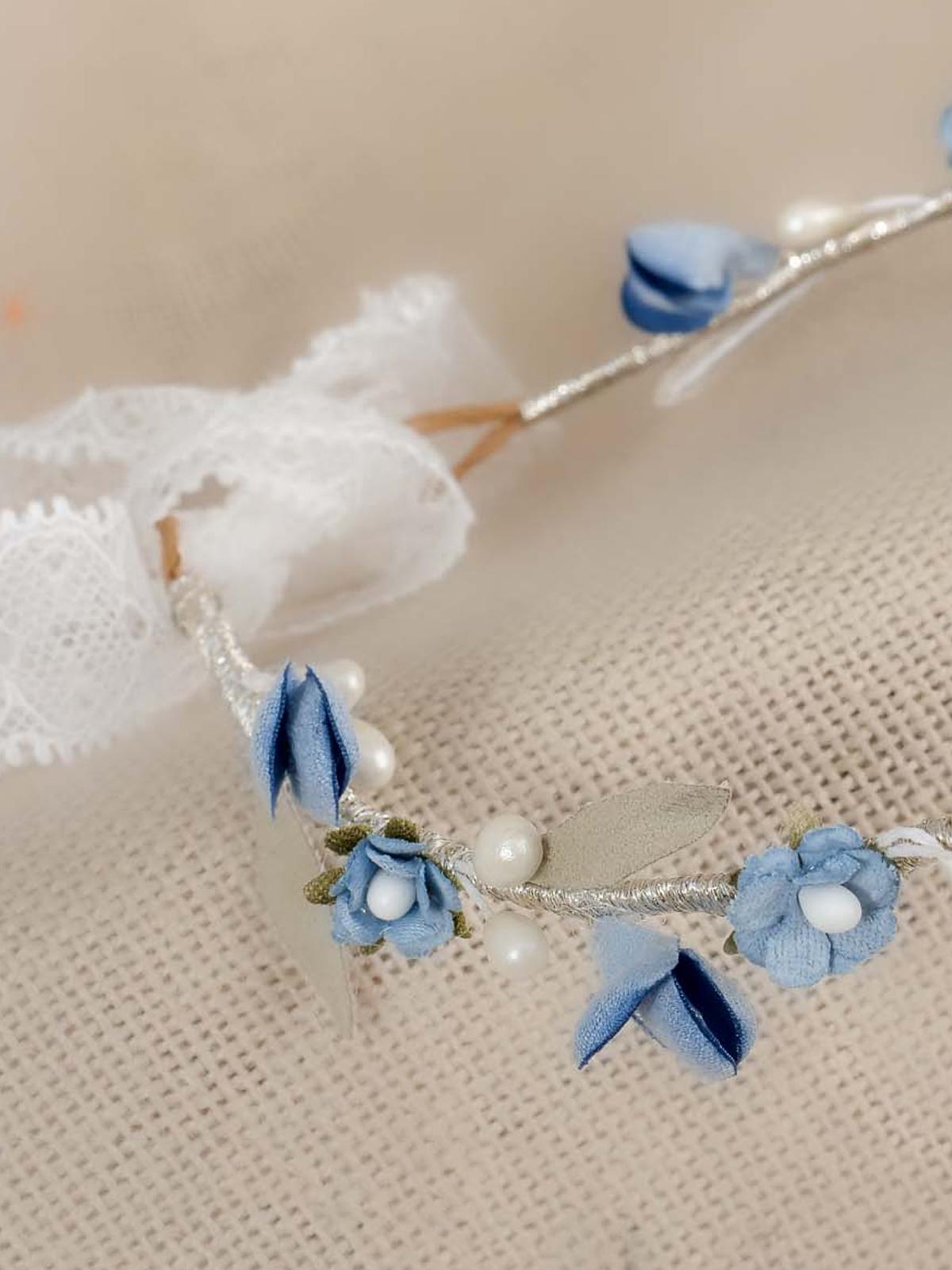 Corona de flores para niña de la nueva colección de Comunión y Ceremonia modelo 20366 de la marca Zoysan, destacan las flores pequeñas de tonos azul, además de unas pequeñas perlas, fabricada de manera artesanal en España.