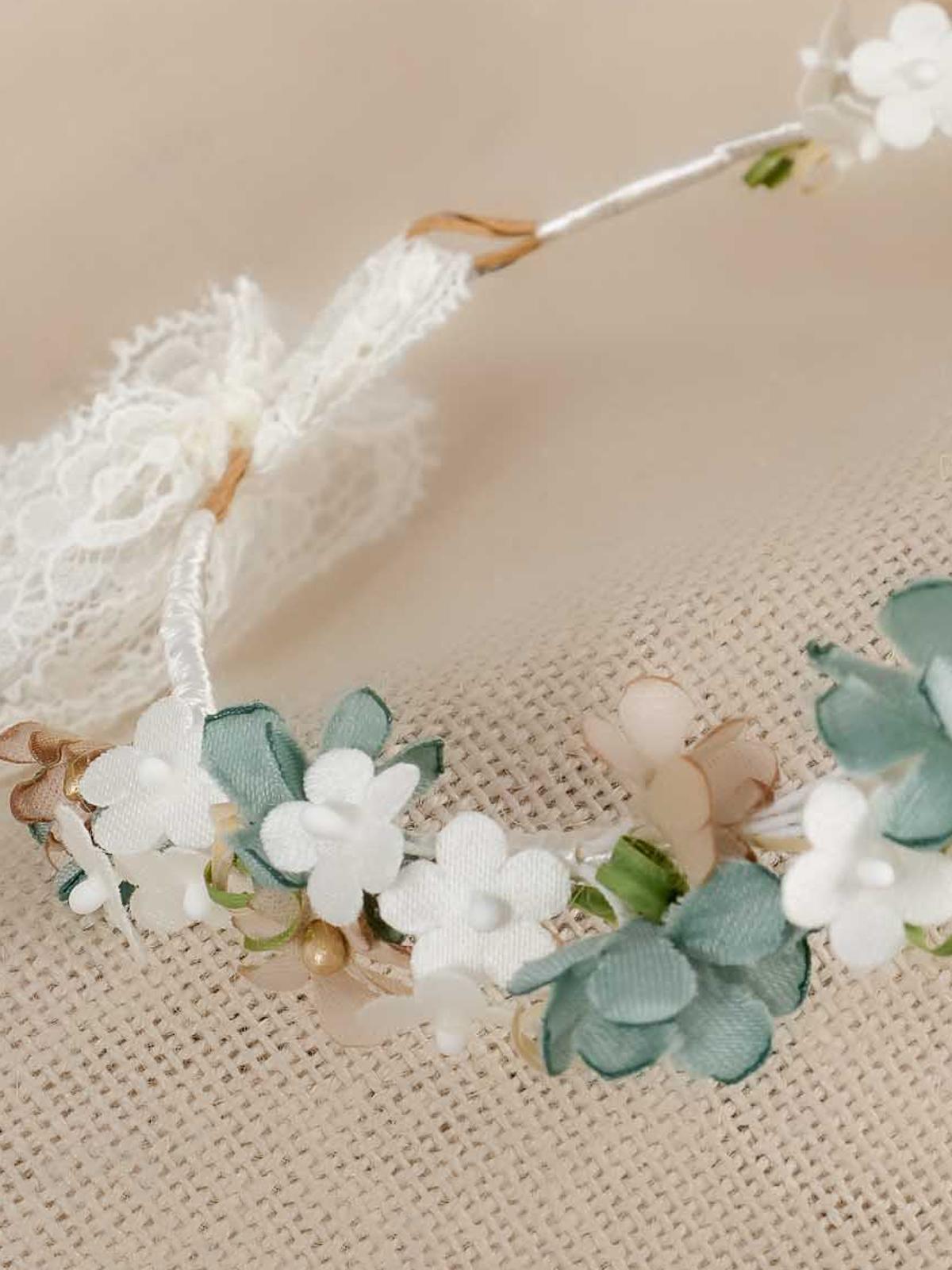 Espectacular corona de flores pequeñas para niña en tonos verde agua, crudo y tostado , también tiene tira de blonda de encaje para ajustar la corona, complemento perfecto para los vestidos de Comunión y Ceremonia, fabricada artesanalmente en España. Viene presentada en bonita caja para regalo.