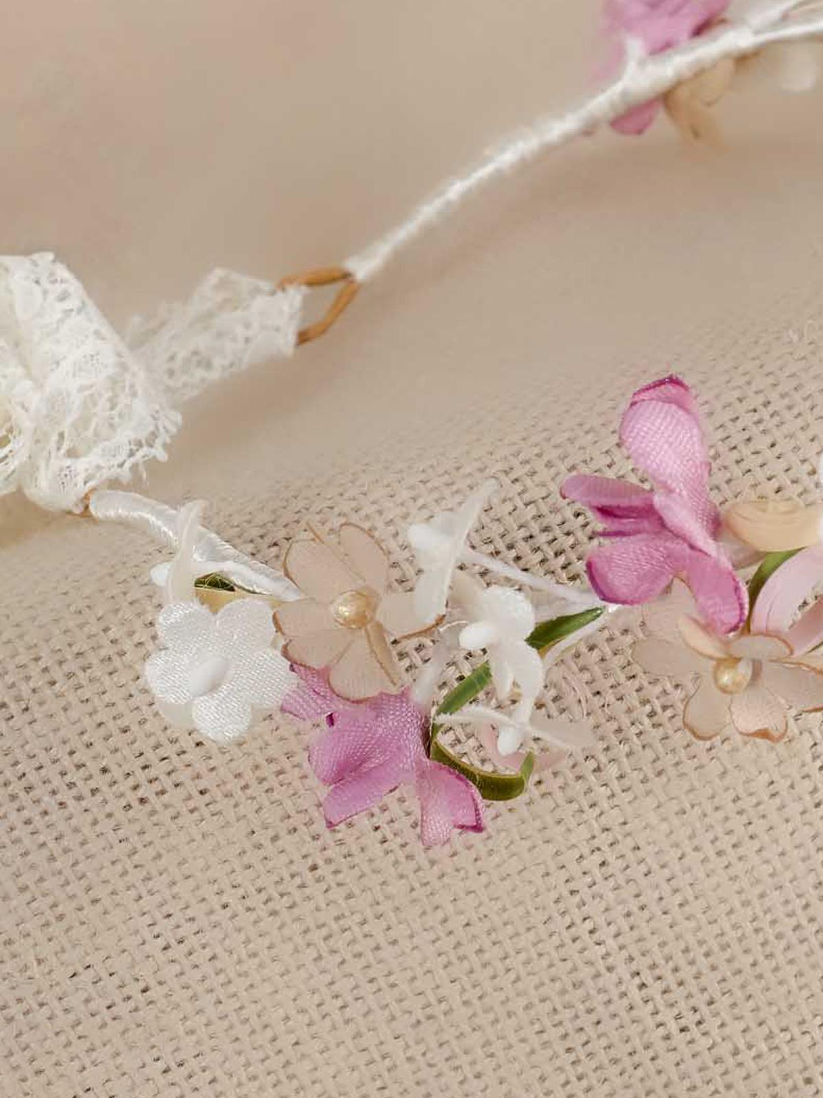 Espectacular corona de flores pequeñas para niña en tonos malva, crudo y tostado , también tiene tira de blonda de encaje para ajustar la corona, complemento perfecto para los vestidos de Comunión y Ceremonia, fabricada artesanalmente en España. Viene presentada en bonita caja para regalo.