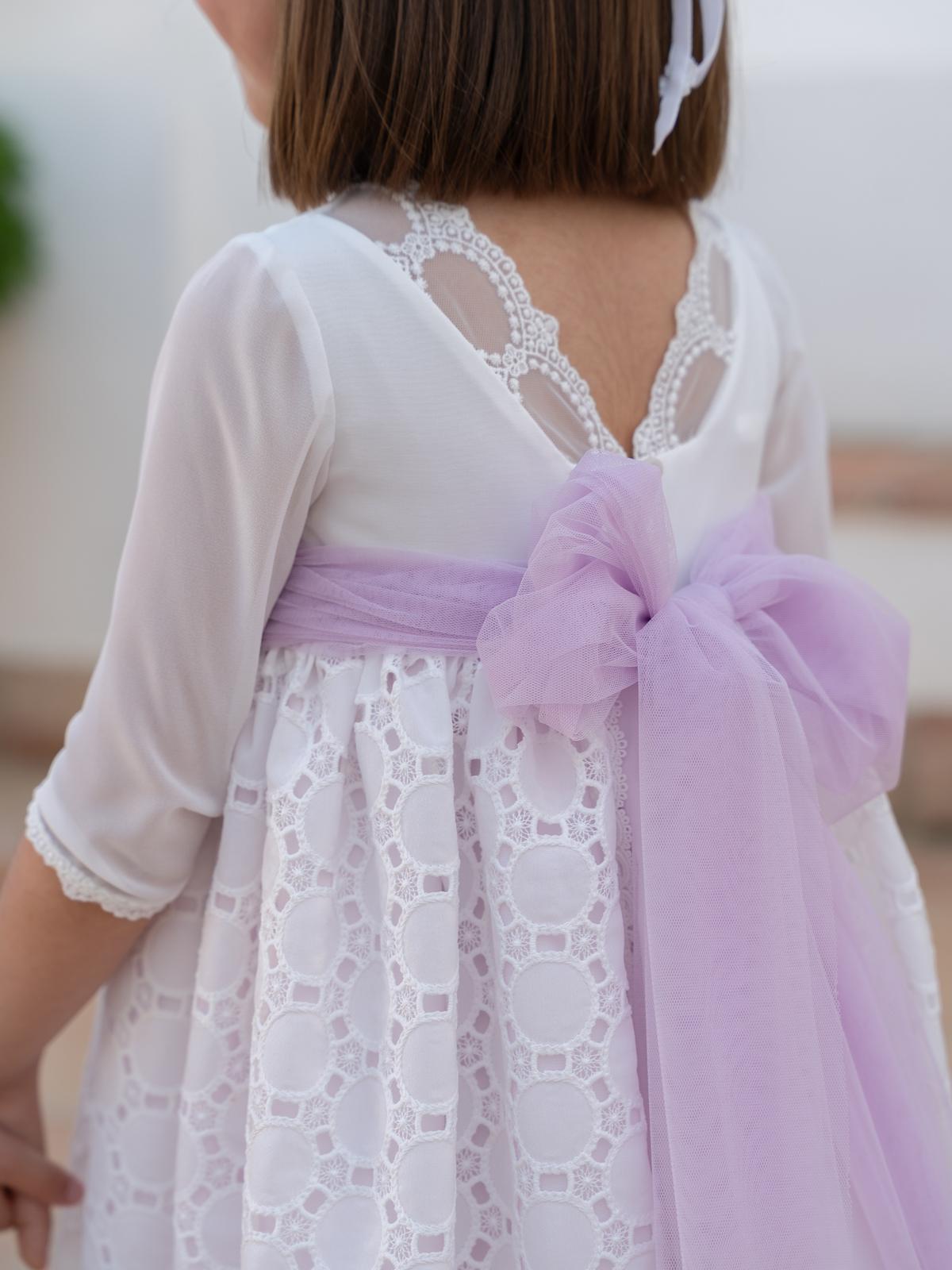 Vestido para ceremonia y arras de niña de la nueva colección de la firma española Eva Martínez Artesanía 2026, modelo 40112 de la familia Mariela, en el largo CBG lleva incluida la braguita, confeccionado en gasa con tejido calado para la falda de media manga con fajín de tul a contraste. FABRICADO EN ESPAÑA. Medidas en la Descripcion.