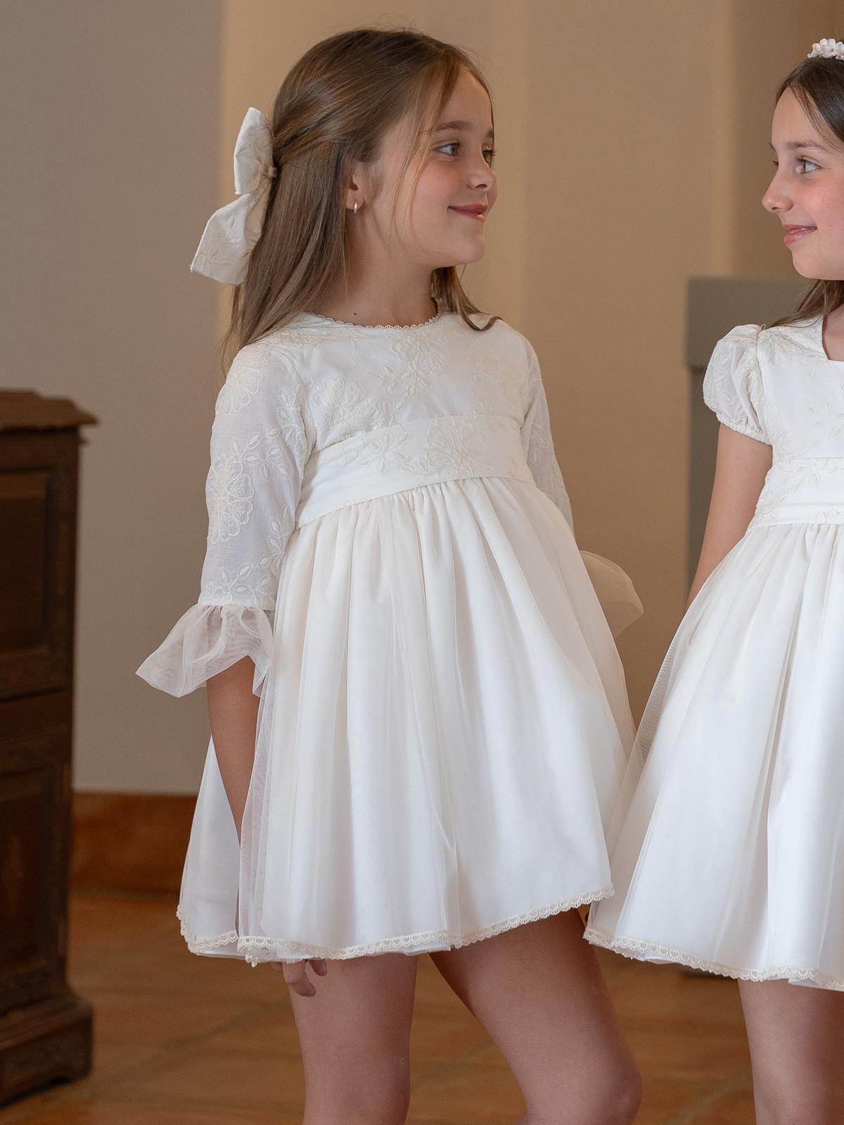 Precioso vestido de media manga confeccionado con tejido en tul bordado en el pecho y en el fajín, tiene escote en pico en la espalda, perfecto tanto como para ceremonia y arras como para bautizo, de talle alto . Modelo de continuidad que estará disponible durante todo el año 2026. Fabricado en España.