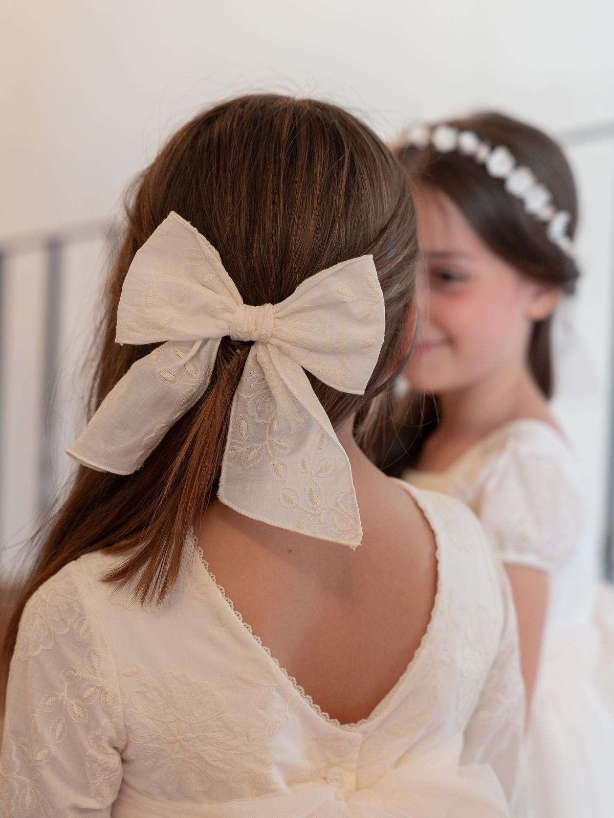 Vestido para ceremonia y arras de niña de la nueva colección de la firma española Eva Martínez Artesanía 2026, modelo 40311 de la familia MIcaela, en el largo CBG lleva incluida la braguita, confeccionado tul bordado para el cuerpo y liso para la falda de media manga con fajín de tul a contraste. FABRICADO EN ESPAÑA. Medidas en la Descripcion.