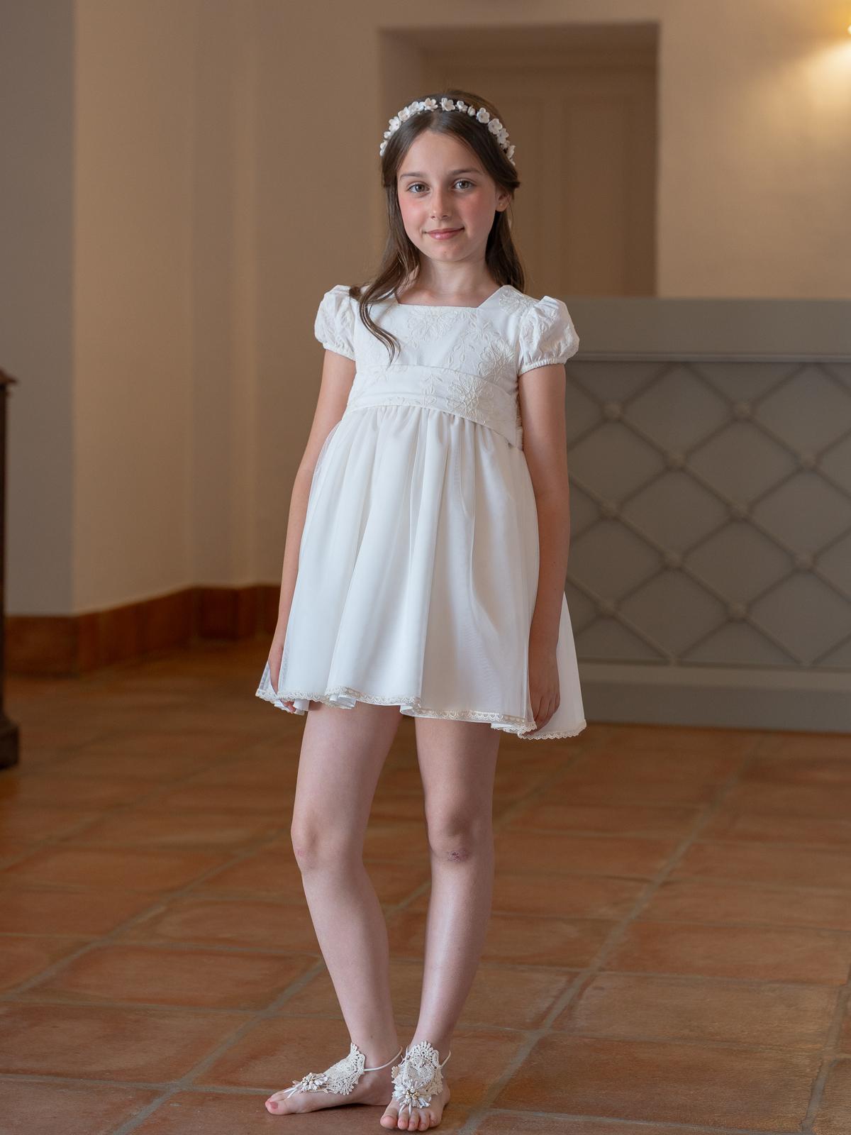 Precioso vestido de manga corta confeccionado con tejido en tul bordado en el pecho y en el fajín, tiene escote en pico en la espalda, perfecto tanto como para ceremonia y arras como para bautizo, de talle alto . Modelo de continuidad que estará disponible durante todo el año 2026. Fabricado en España.