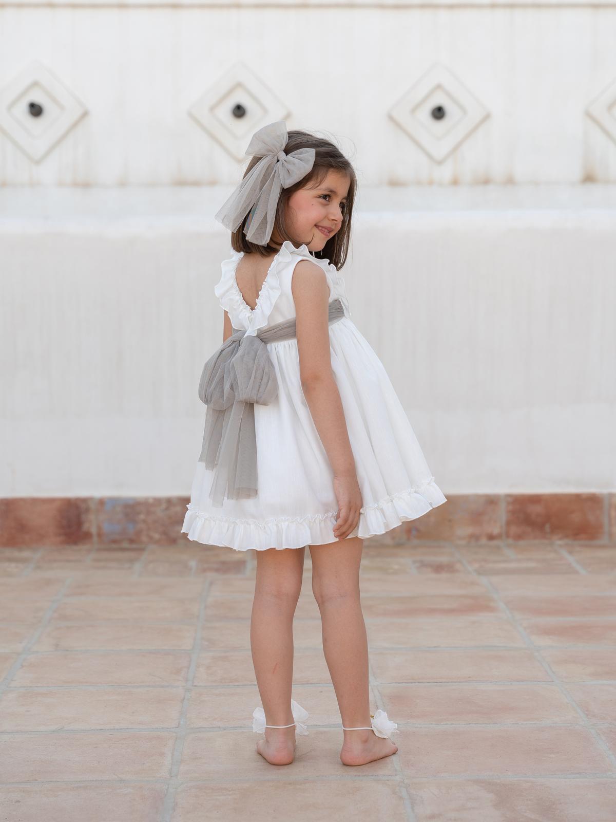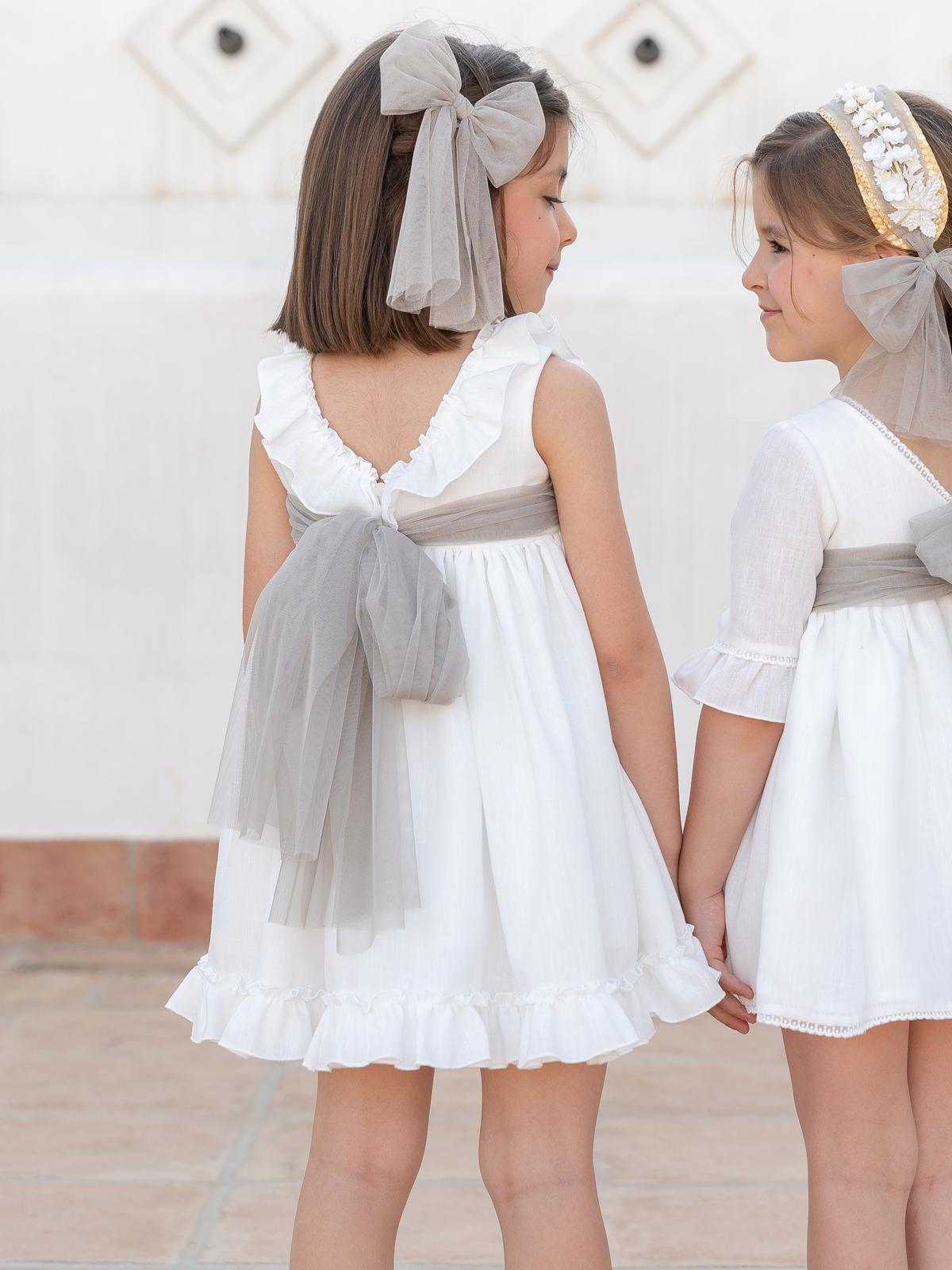 Vestido para ceremonia y arras de niña de la nueva colección de la firma española Eva Martínez Artesanía 2026, modelo 40412 tirantes de la familia Martina, en el largo CBG lleva incluida la braguita, confeccionado en semi hilo con fajín de tul a contraste. FABRICADO EN ESPAÑA. Medidas en la Descripcion.