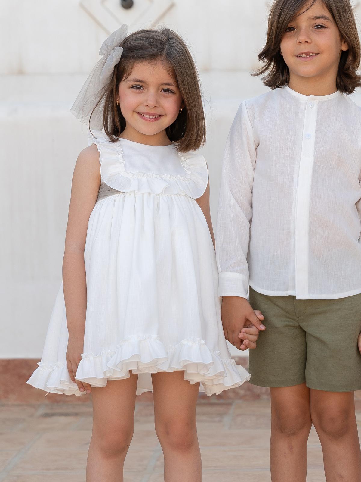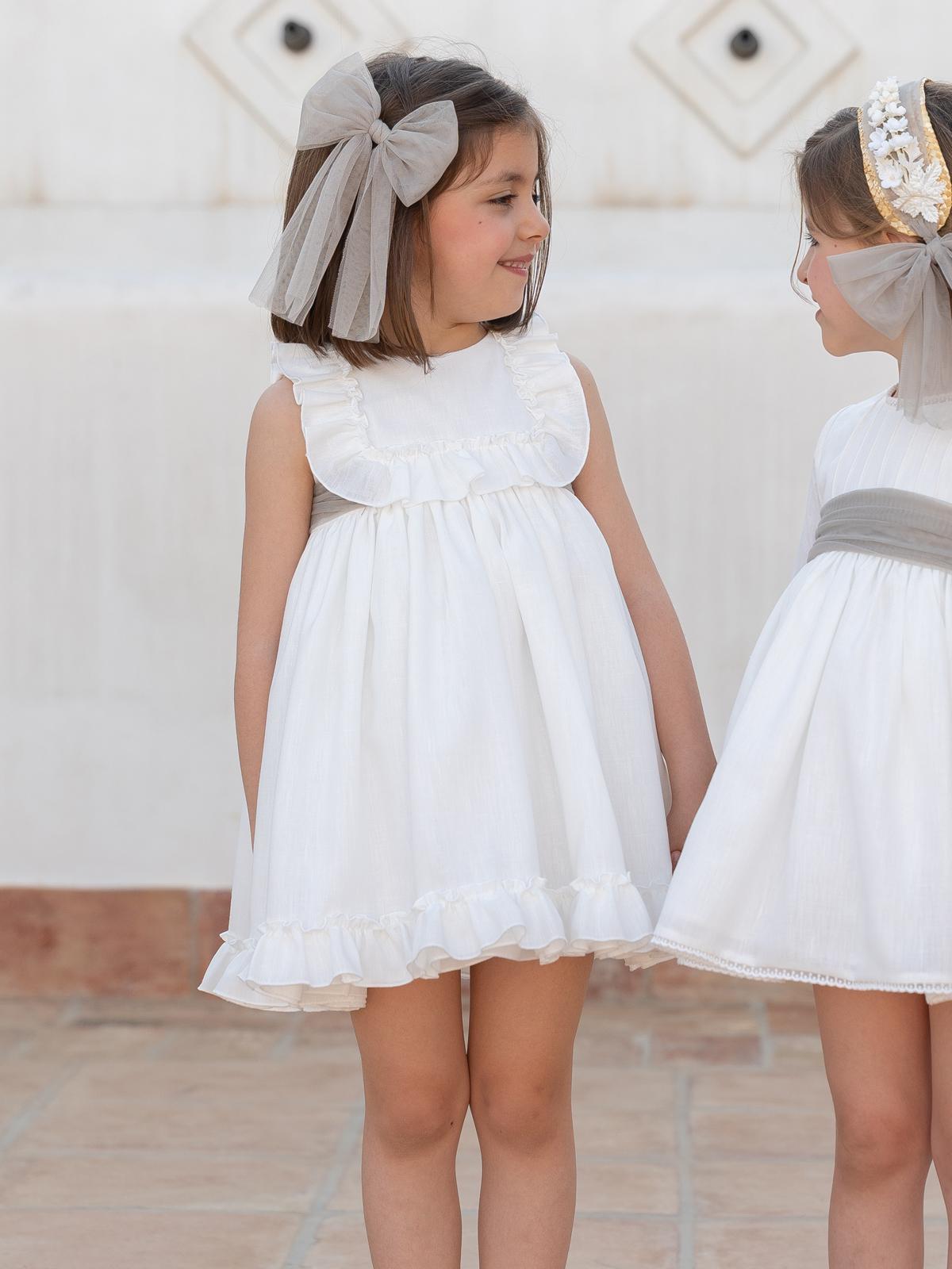 Precioso vestido sin mangas confeccionado con tejido en semihilo, tiene fafín a contraste de color que puede ser en diferentes tonos, perfecto tanto como para ceremonia y arras como para bautizo, de talle alto . Modelo de continuidad que estará disponible durante todo el año 2026. Fabricado en España.