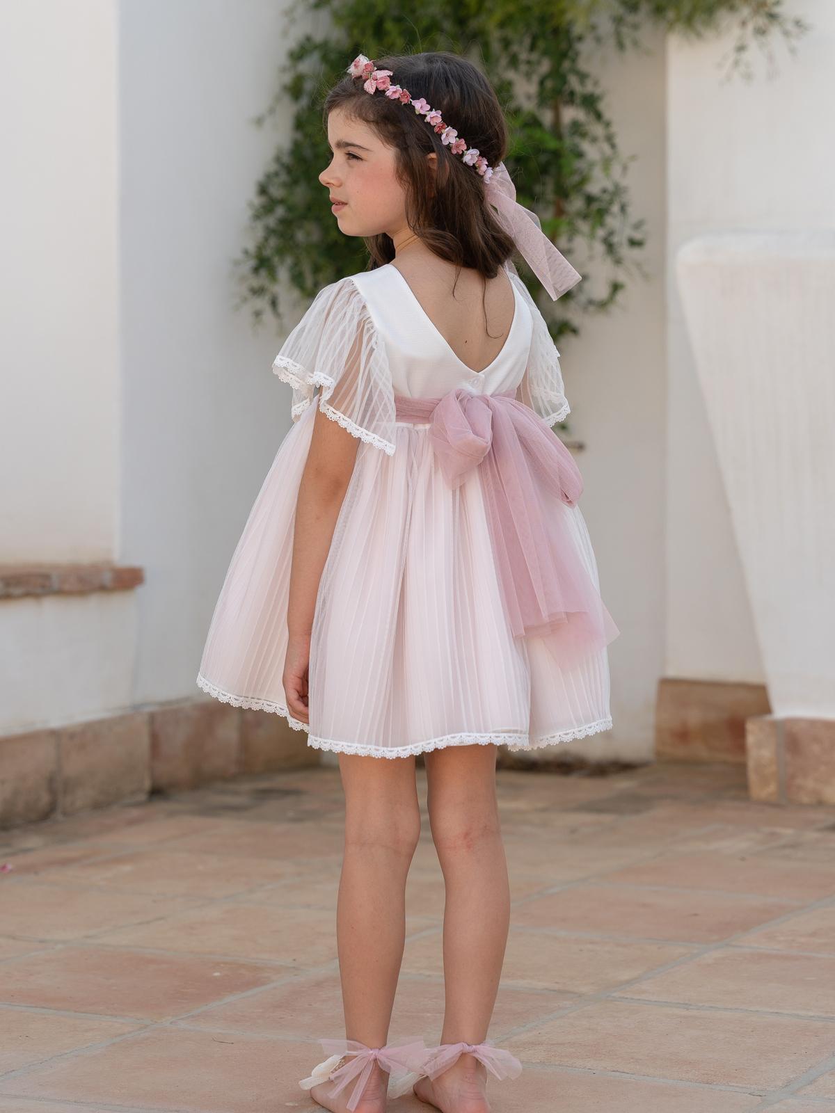Vestido para ceremonia y arras de niña de la nueva colección de la firma española Eva Martínez Artesanía 2026, modelo 40512 de la familia Miranda manga corta, en el largo CBG lleva incluida la braguita, confeccionado en original tejido ratado con fajín de tul a contraste. FABRICADO EN ESPAÑA. Medidas en la Descripcion.