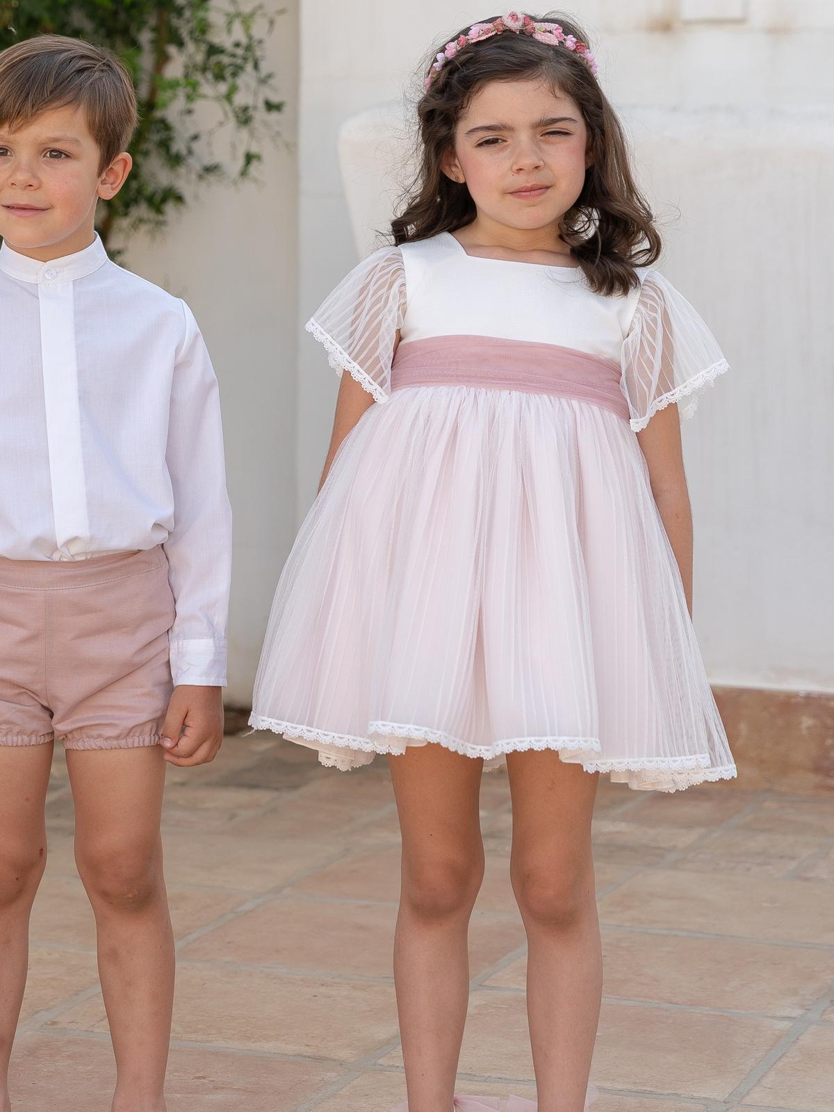 Precioso manga corta confeccionado en muy original tejido de tul rayado, tiene fafín a contraste de color que puede ser en diferentes tonos, perfecto tanto como para ceremonia y arras como para bautizo, de talle alto . Modelo de continuidad que estará disponible durante todo el año 2026. Fabricado en España.