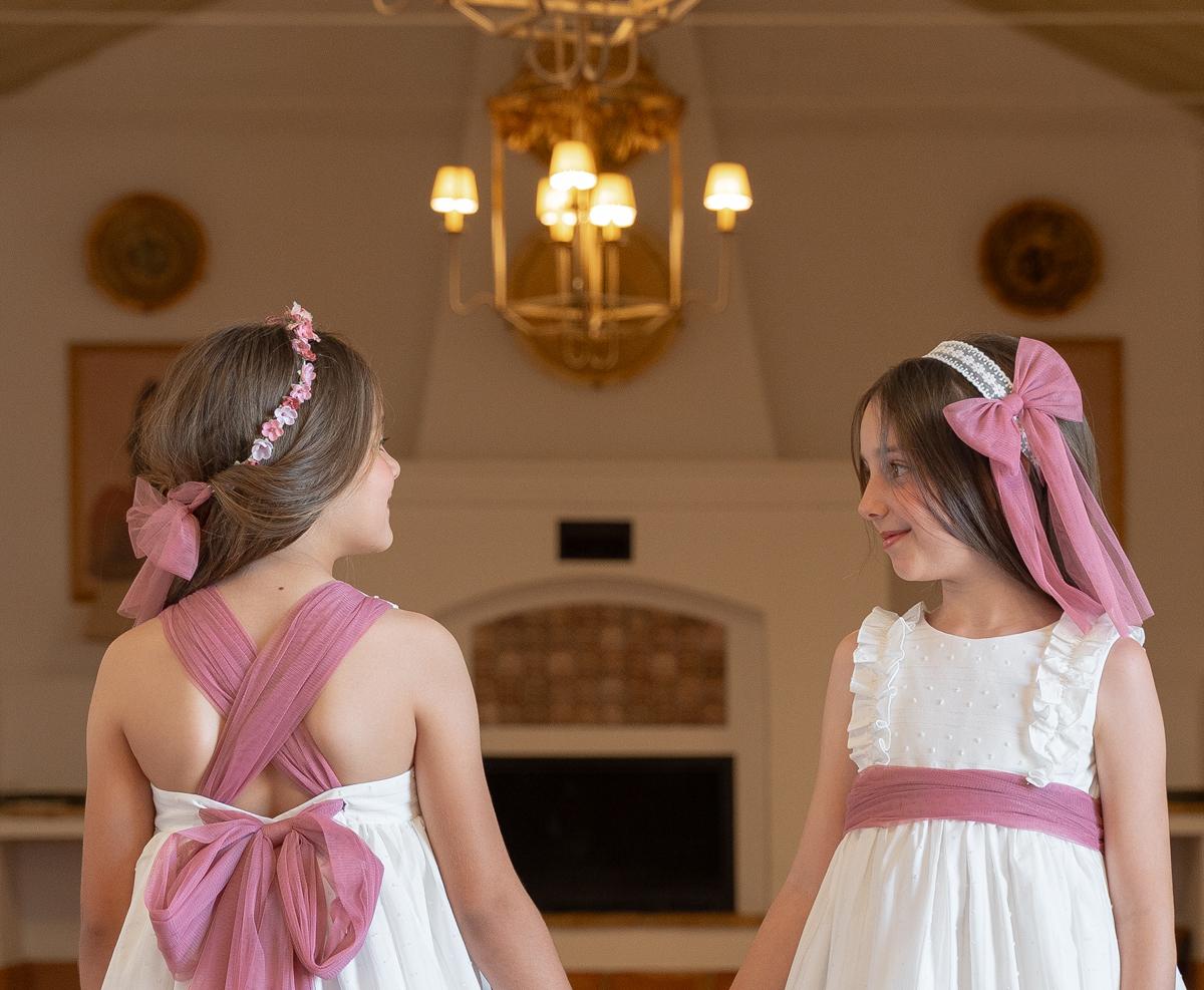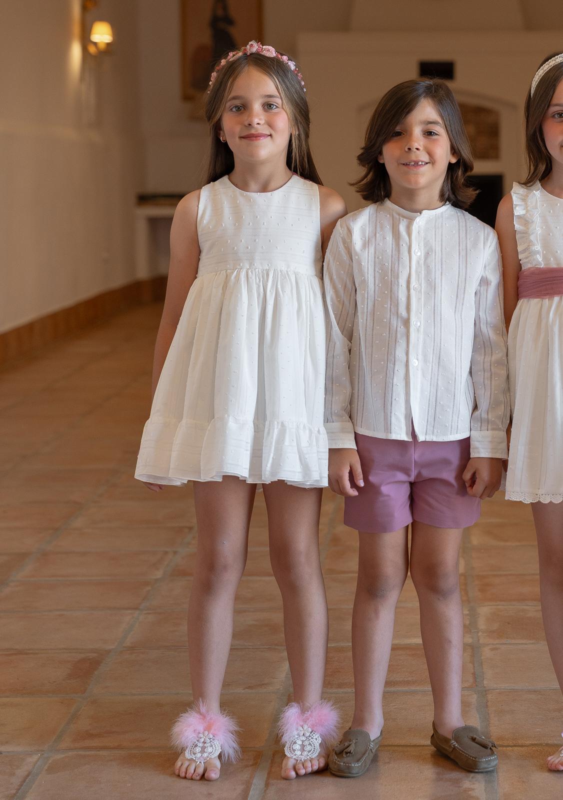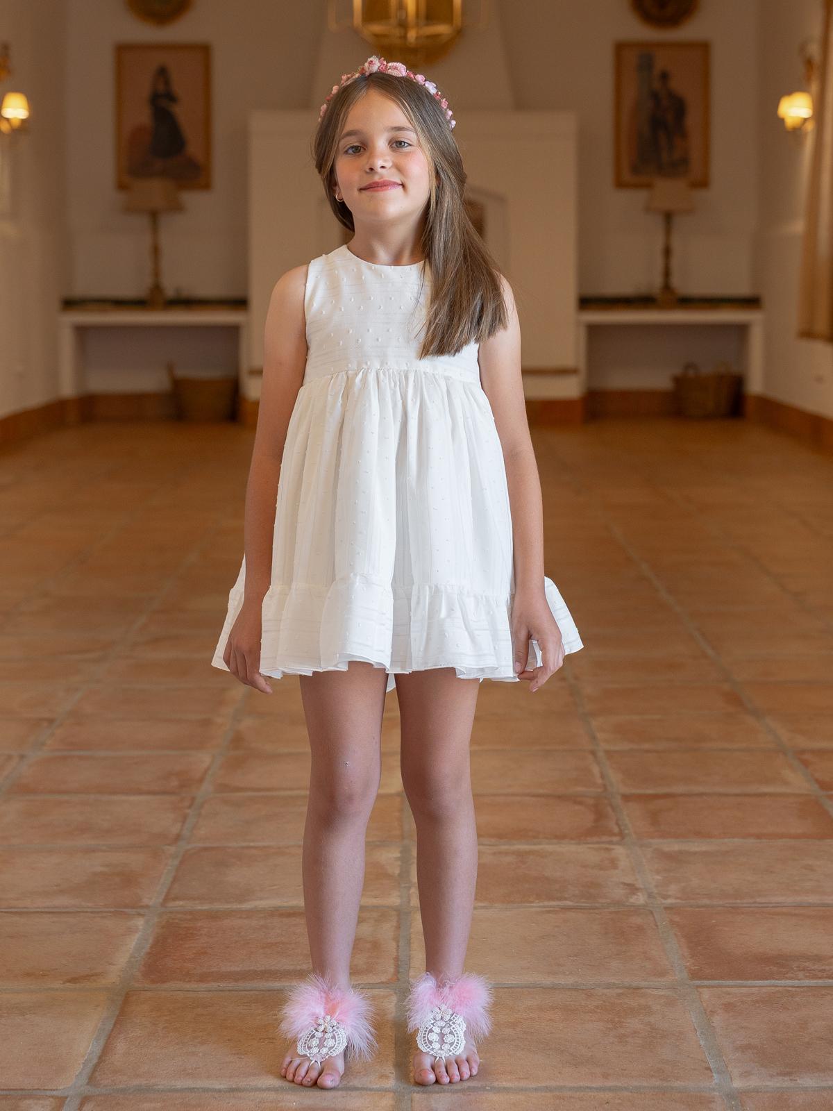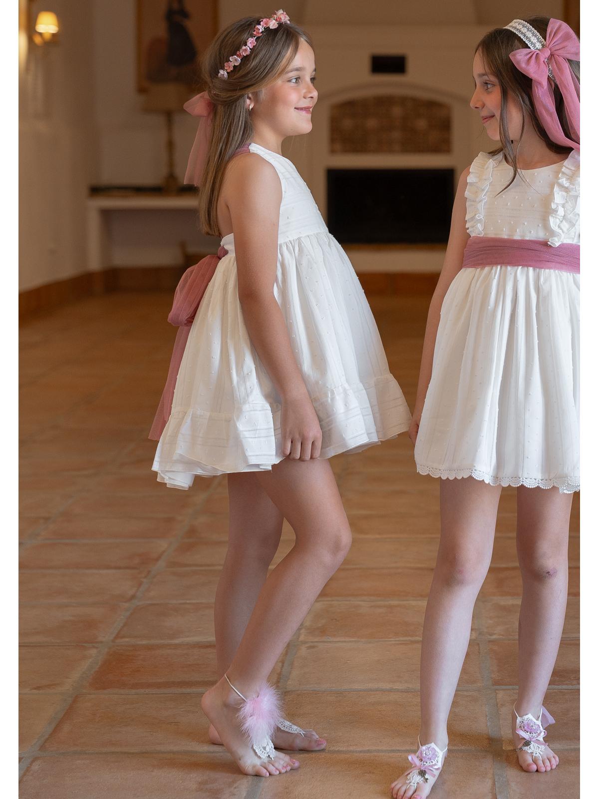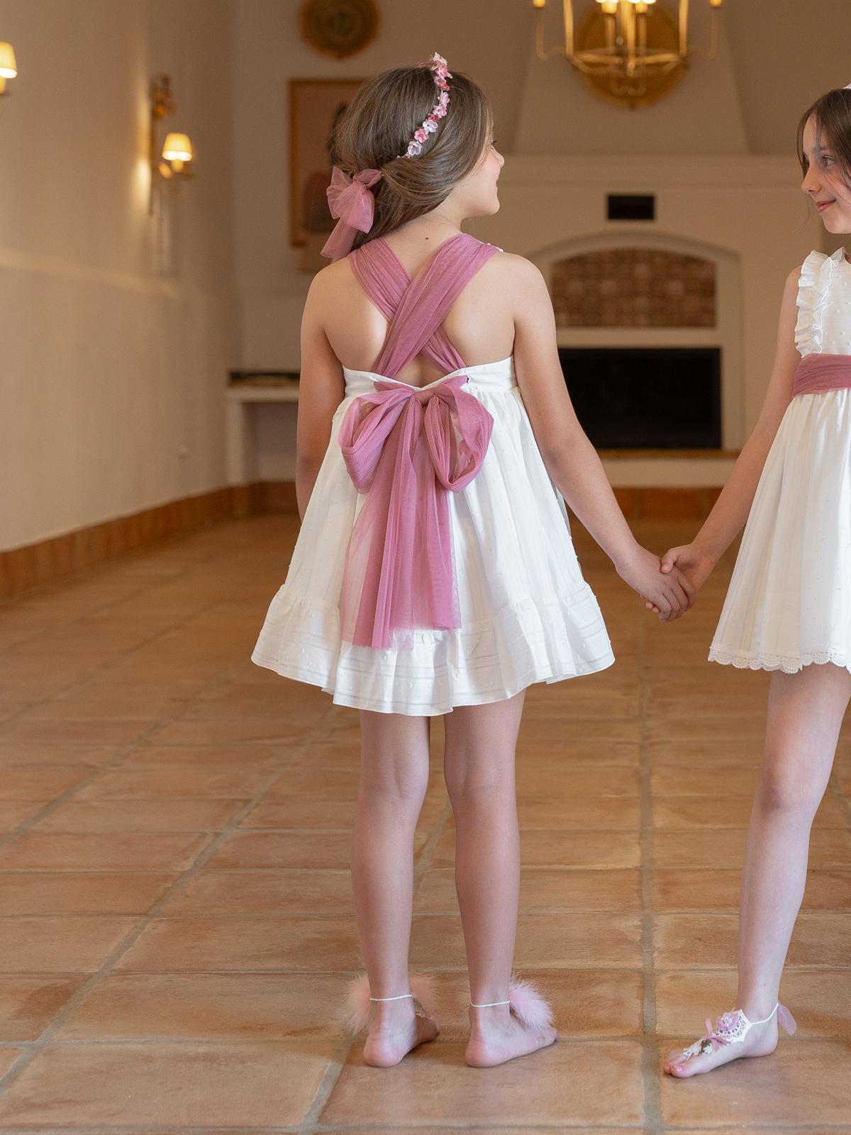 Precioso vestido de tirantes, confeccionado en original tejido de plumeti tipo jaquard que hace unas pequeñas rayas tiene tul haciendo de tirantes en la original espalda, perfecto tanto como para ceremonia y arras como para bautizo, de talle alto . Modelo de continuidad que estará disponible durante todo el año 2026. Fabricado en España.