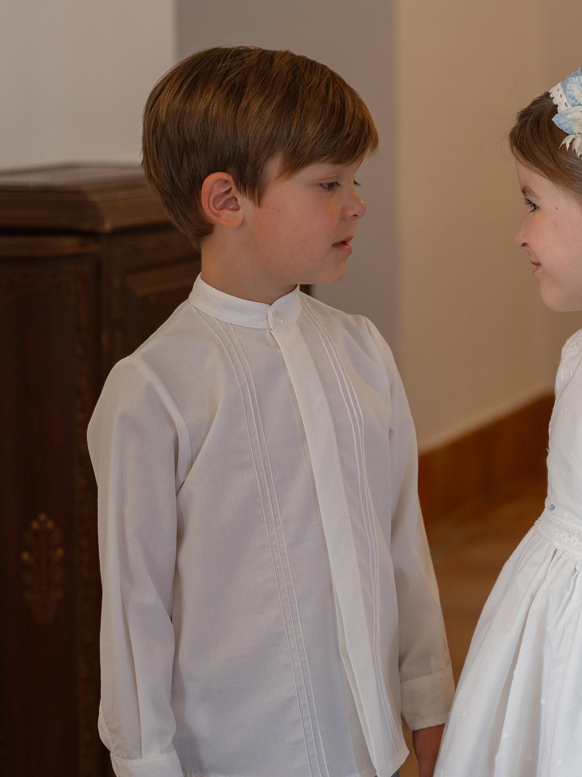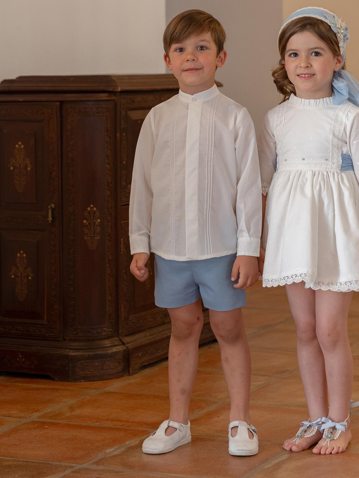 Precioso conjunto perfecto para ceremonia y arras y también para bautizo, compuesto por camisa con cuello mao de popelim con jaretas y tapeta para los botones y pantalón básico con cinturilla ajustable de lino con tirantes. Es un modelo de continuidad que esta disponible durante todo el año. Perfecto para combinar con la misma familia de vestidos de niña. Fabricado en España.