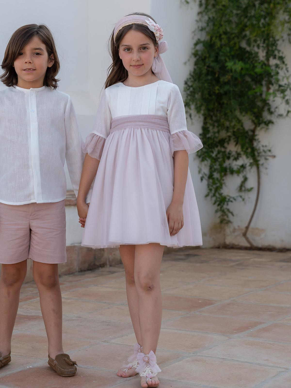 Precioso vestido de media manga, confeccionado en tul para la falda al igual que el fajín que puede ser de diferentes colores, y parte de arriba con tejido rústico donde podemos ver tablas decorativas, perfecto tanto como para ceremonia y arras como para bautizo, de talle alto . Modelo de continuidad que estará disponible durante todo el año 2026. Fabricado en España.