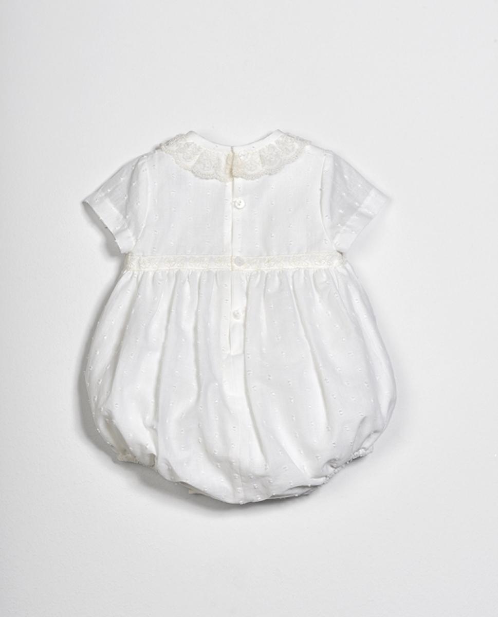 Pelele de bebé de bautizo de manga corta de organza de plumeti algodón bordao, un clásico renovado. Tiene varias puntillas decorativas en toda la parte delantera. Va todo el pelele forrado en popelín crudos. FABRICADO EN ESPAÑA.