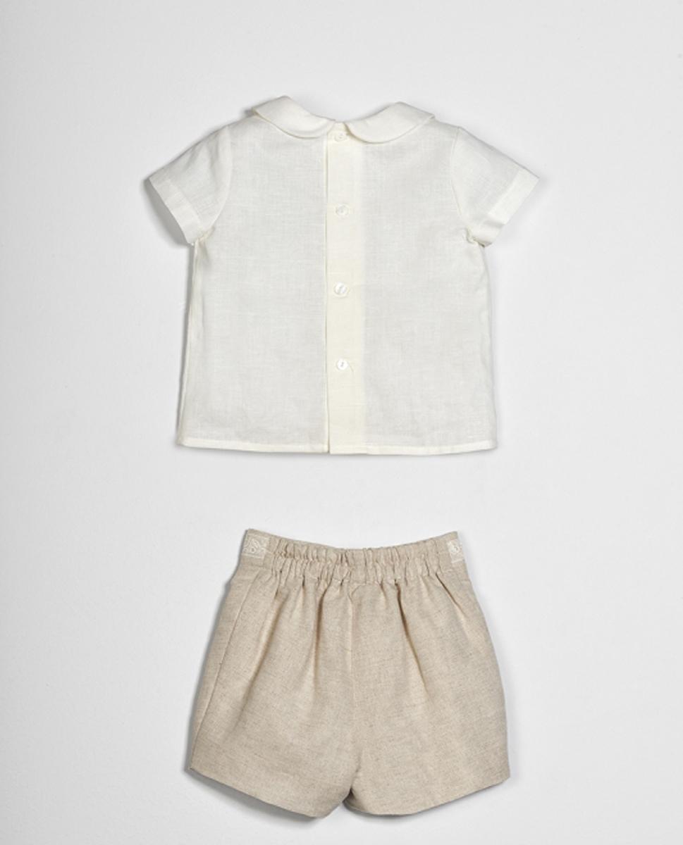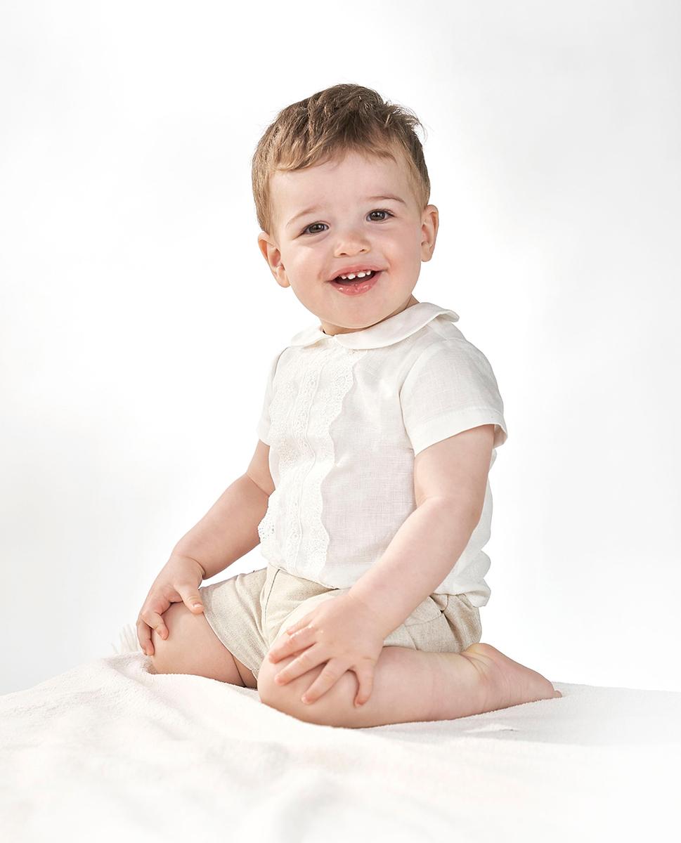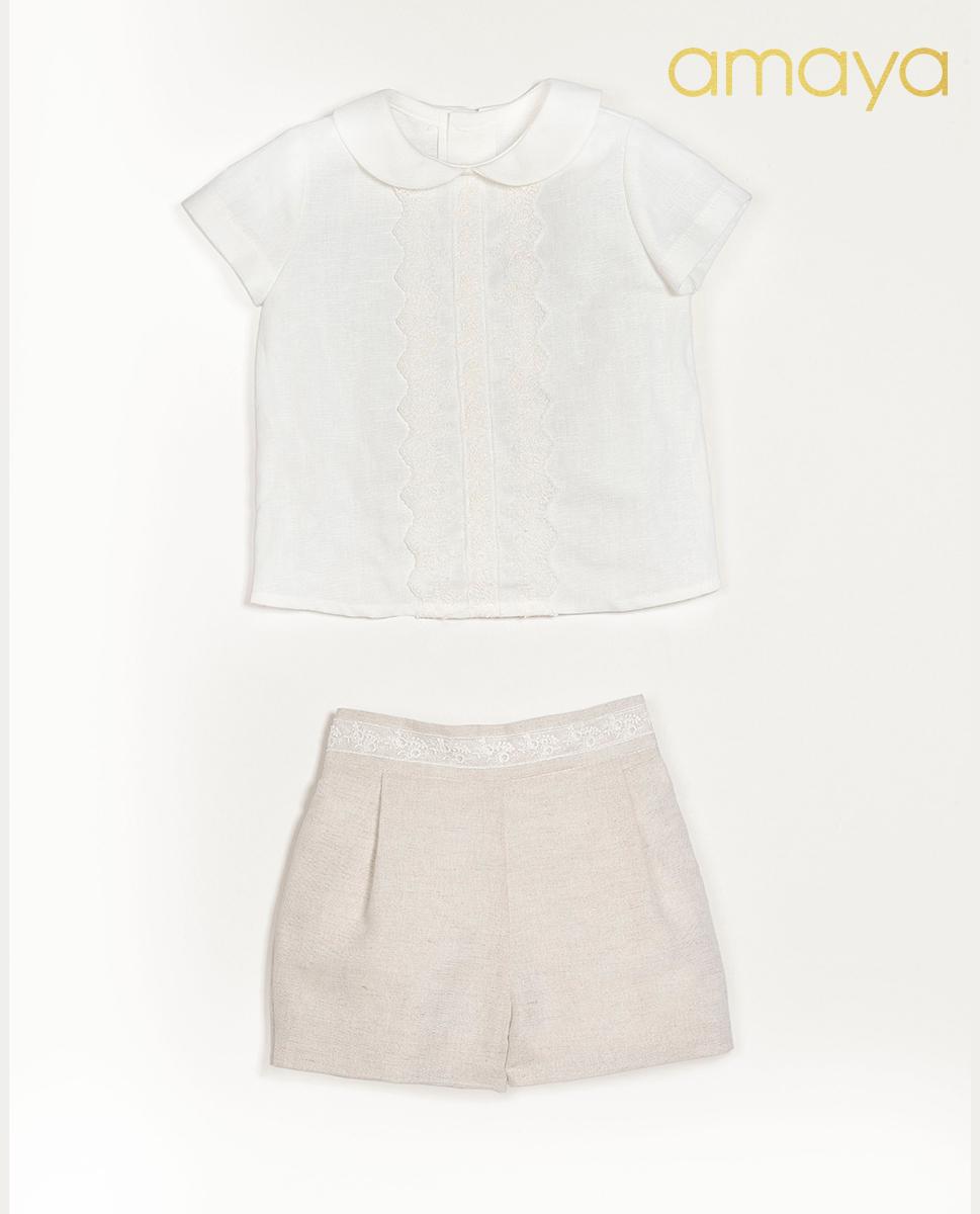 Espectacular traje de bautizo para bebe niño de nuestra firma premium Amaya, modelo 632165, lo encontramos dentro de nuestra colección de Bautizo para niño, confeccionado con materiales de muy alta calidad, lleva blusa de lino de manga corta con cuello bebe y bordados, pantalón corto de lino tostado con puntilla decorativa en la cintura. FABRICADO EN ESPAÑA.