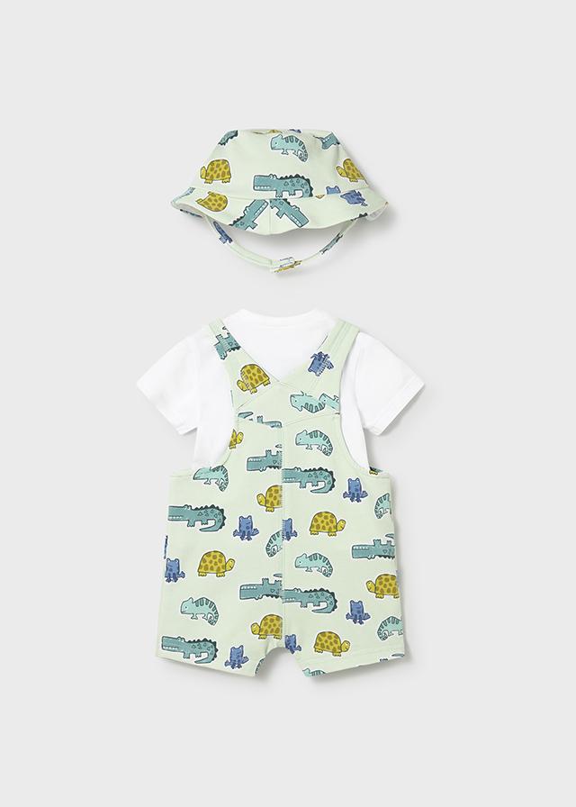 Muy bonito conjunto de peto corto para bebe niño con gorrito que pertenece a la nueva colección de Mayoral 2026 newborn para esta primavera verano 2026, compuesto peto de algodón estampado con tortugas y cocodrilos, camiseta de manga corta y gorrito del mismo tejido que el peto.