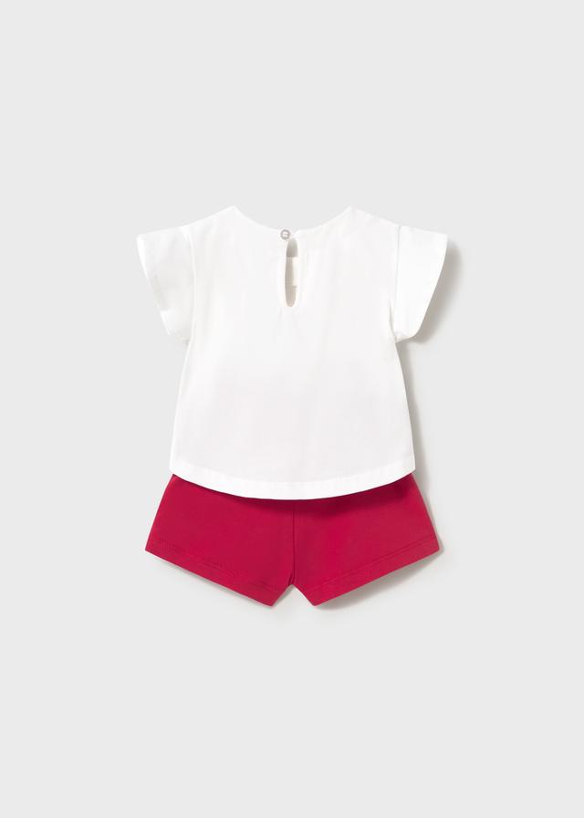 Pack de dos conjuntos cortos para bebe niña de la nueva colección de Mayoral 2026 newborn para esta primavera verano, compuesto por dos shorts, uno estampado con fresas y el otro en color rojo liso, se completa con dos camisetas de manga corta una blanca con dibujo de unas fresas y otras en rojo con flores.