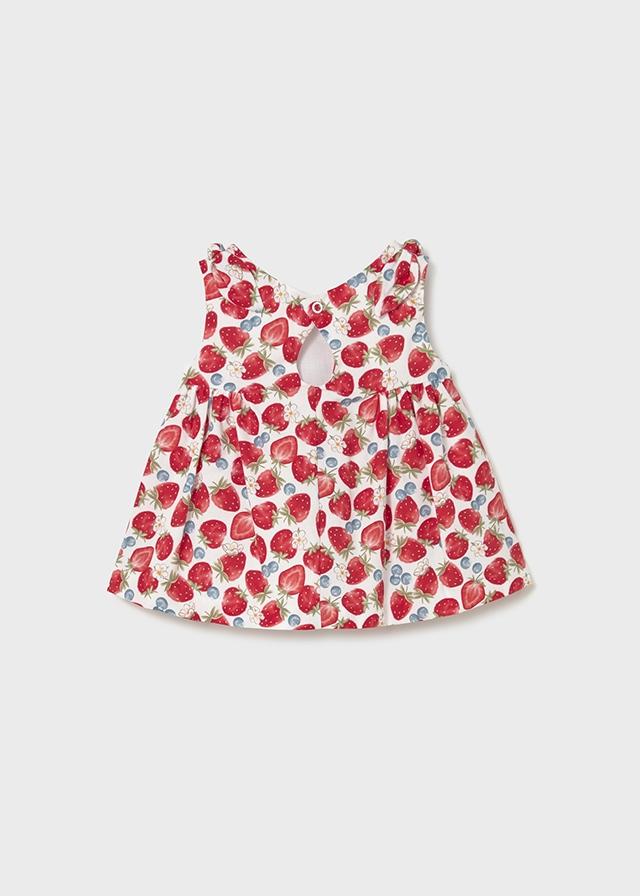 Vestido para bebe niña especialmente diseñado para los días de más calor del verano, confeccionado en algodón de alta calidad estampado por toda la superficie con fresas.