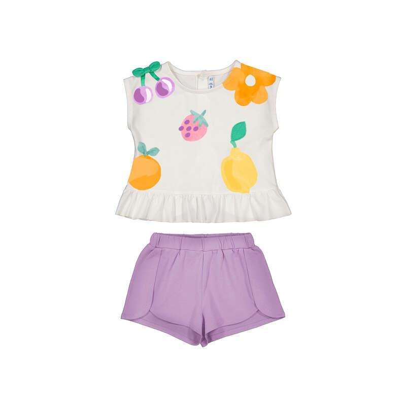 Nuevo conjunto playero de short de la nueva colección de Mayoral bebe niña 2026 para esta primavera verano, compuesto por short de color malva y camiseta de manga corta con estampación en la parte delantera.
