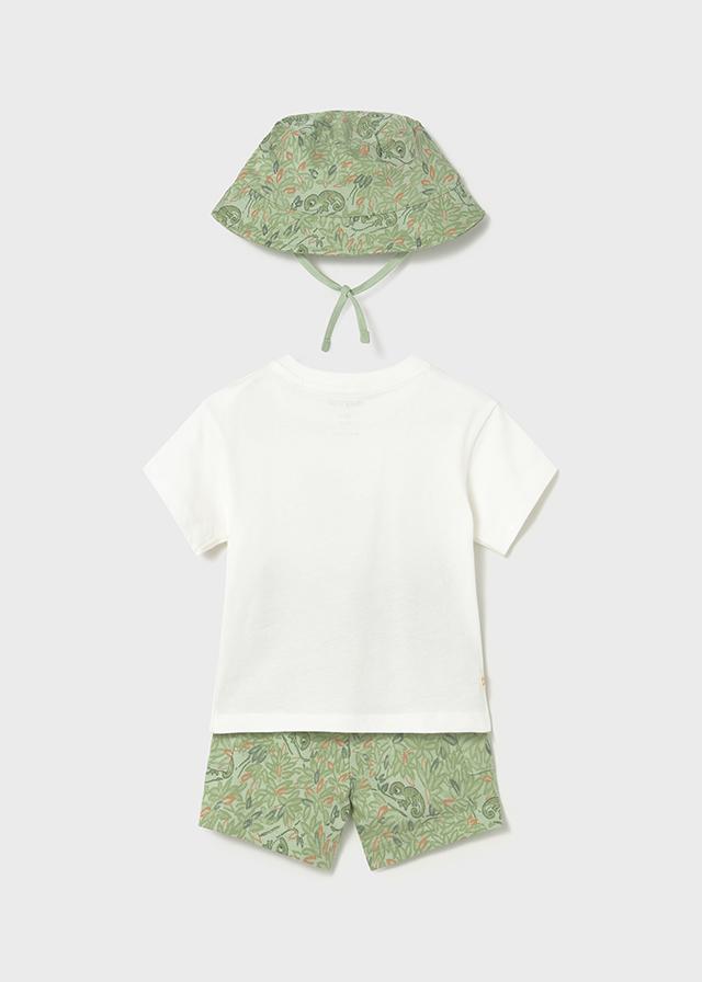 Conjunto con gorrito que es perfecto para los días de más calor del verano, compuesto por camiseta de manga corta con dibujo en el delantero de un camaleon, pantalón corto estampado en tonos verde y gorrito del mismo tejido.