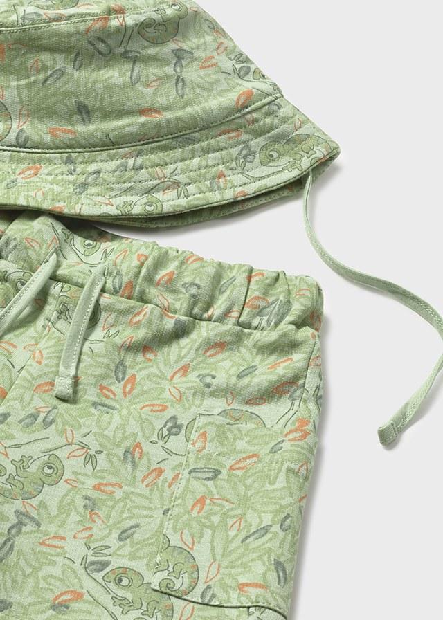 Nuevo conjunto que viene con gorro de la nueva colección de primavera verano de Mayoral bebe niño 2026, compuesto por bermuda y gorrito estampado en tonos verdes y camiseta de manga corta con dibujo en el delantero de un camaleón.