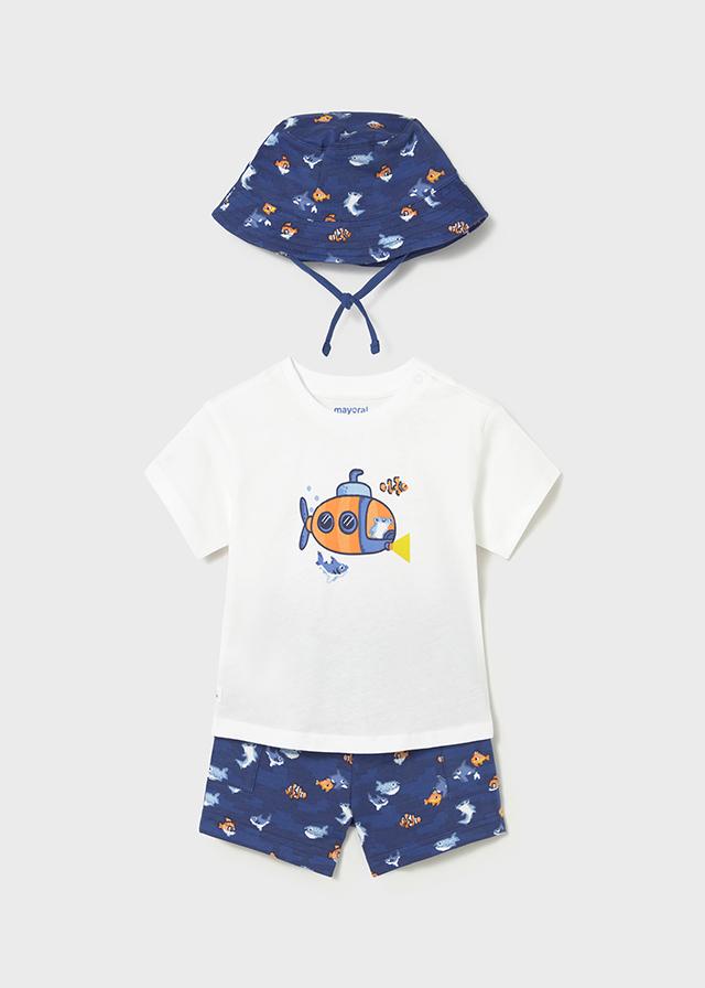 Conjunto con gorrito que es perfecto para los días de más calor del verano, compuesto por camiseta de manga corta con dibujo en el delantero de un submarino, pantalón corto estampado en marino con motivos del mar.