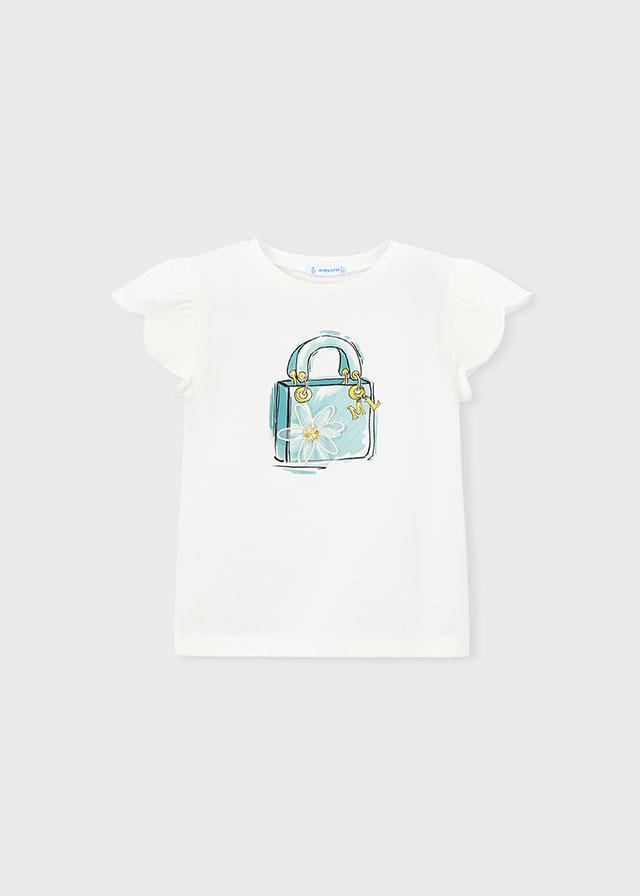 Bonita camiseta de niña de la marca Mayoral confeccionada en algodón elástico de alta calidad, destaca por lo original de sus mangas que hacen como unos pequeños volantes, y por el dibujo de la parte delantera de un bolso con apliques.