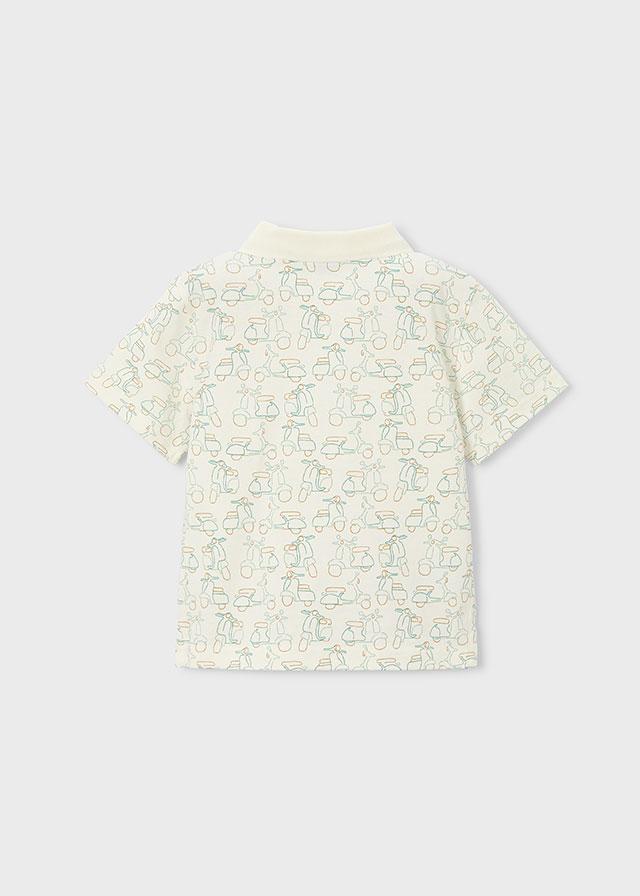 Nuevo polo de manga corta de la colección de Mayoral de niño para esta primavera verano 2026 modelo 26-03104-085 confeccionado en algodón blanco estampado por todo él con pequeñas motos vespa.