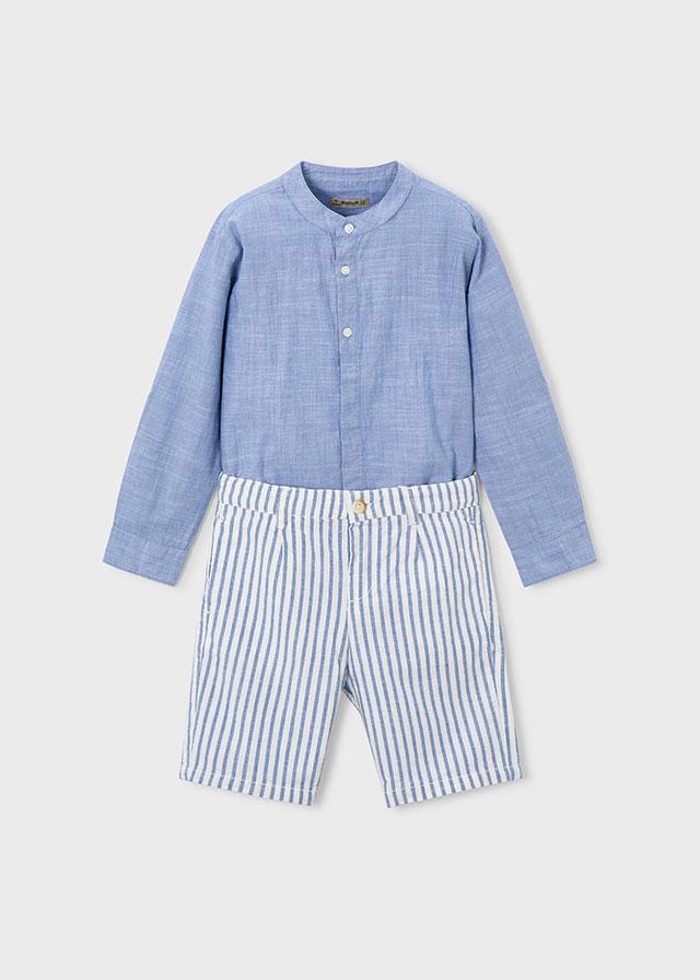 Muy elegante conjunto de vestir para niño de la firma Mayoral, compuesto por camisa de cuello mao en color azul cuello mao y abotonada hasta medio pecho, se completa con bermuda de vestir confeccionada en tejido de lino de rayas, tiene cinturilla ajustable con goma botonera.