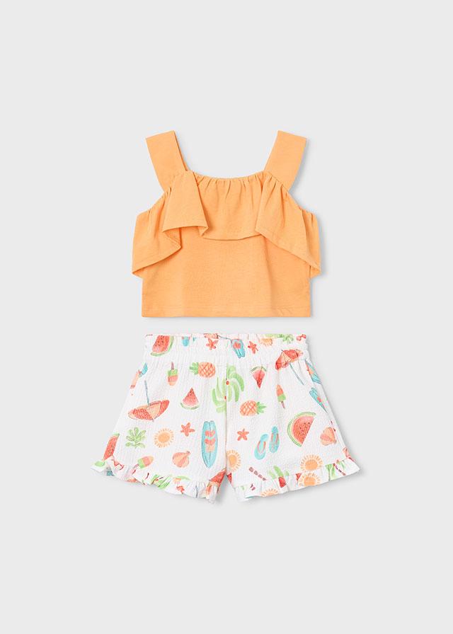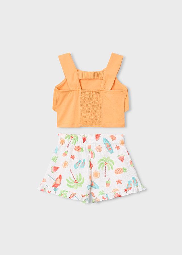 Precioso conjunto de short de la nueva colección de Mayoral niña modelo 26-03230-076 para esta primavera verano 2026, compuesto por short de tejido estampado multicolor con temática de la playa, y top de tirantes en color naranja con volante.