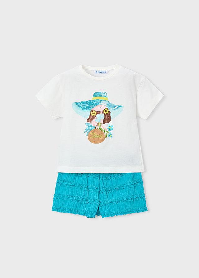 Precioso conjunto de short de la nueva colección de Mayoral niña modelo 26-03231-074 para esta primavera verano 2026, compuesto por short con pequeños volantes de color turquesa y camiseta de manga corta con dibujo decorativo en el delantero.