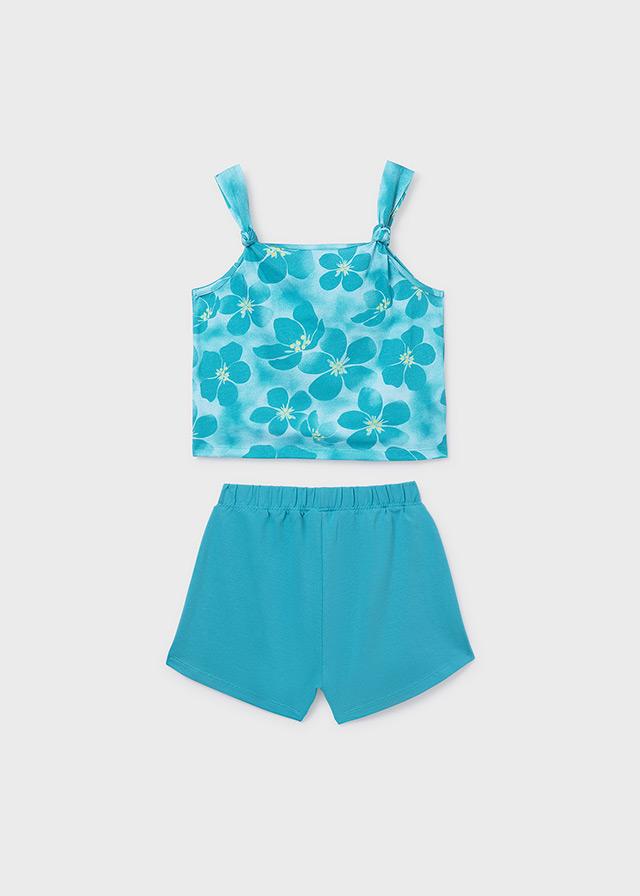 Llamativo conjunto de la nueva colección de Mayoral niña 2026 para esta primavera verano, modelo 26-06210-065 compuesto por top de tirantes estampado y short liso en color turquesa.