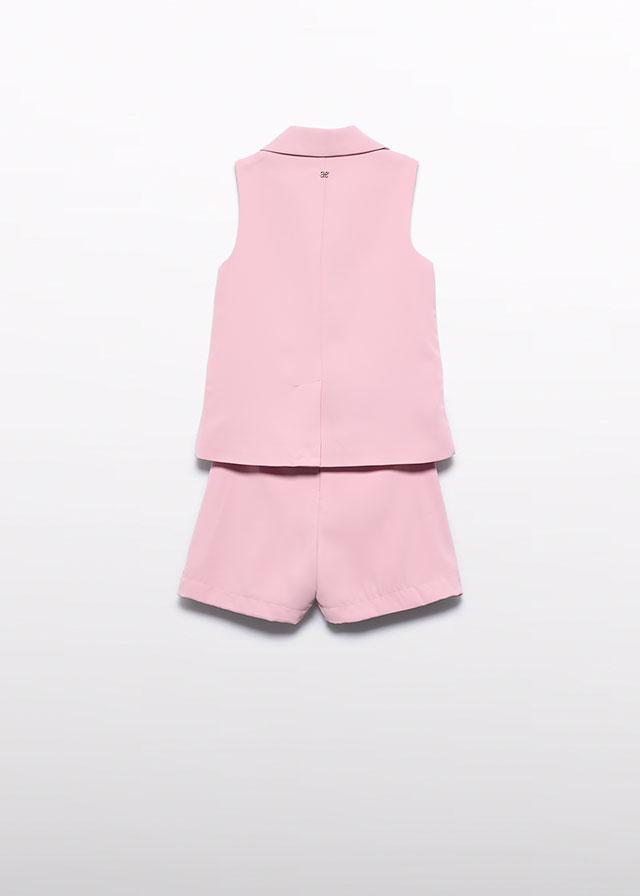 Muy original y espectacular conjunto para vestir a nuestra niñas adolescentes para cualquier evento y celebración, compuesto por chaleco y bermuda en el mismo tejido de crepe de color rosa. Esta especialmente diseñado para niñas adolescentes que usan desde la talla 10 años hasta 16 años.