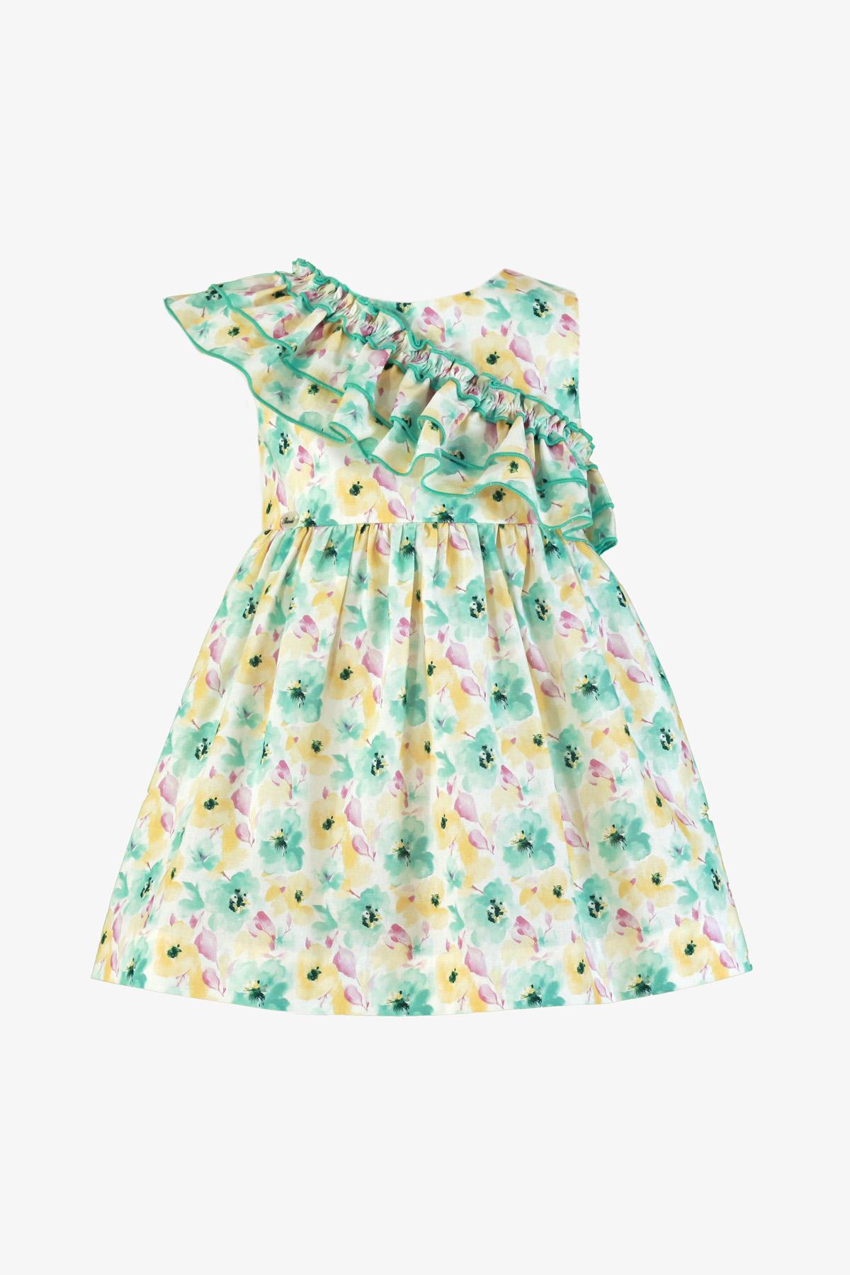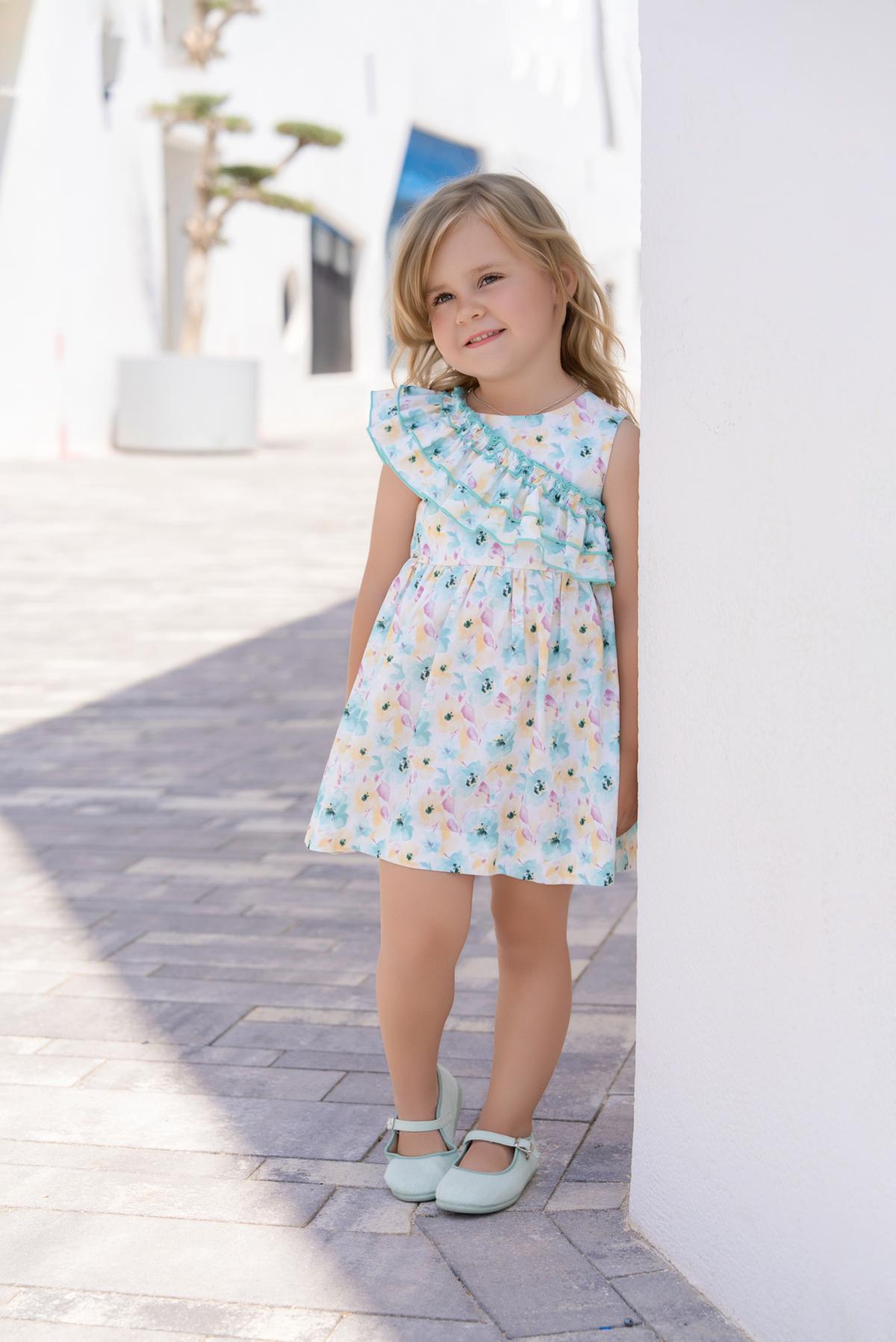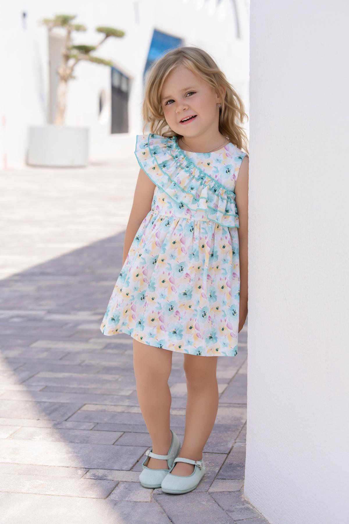 Nuevo vestido de tirantes para niña de la colección de Miranda 2026 para esta primavera verano, modelo 612-V, confeccionado en tejido estampado de tonos turquesa, tiene una forma muy original asimetrica con volantes en el pecho.