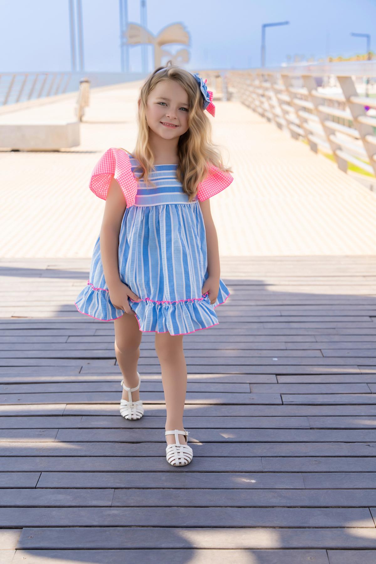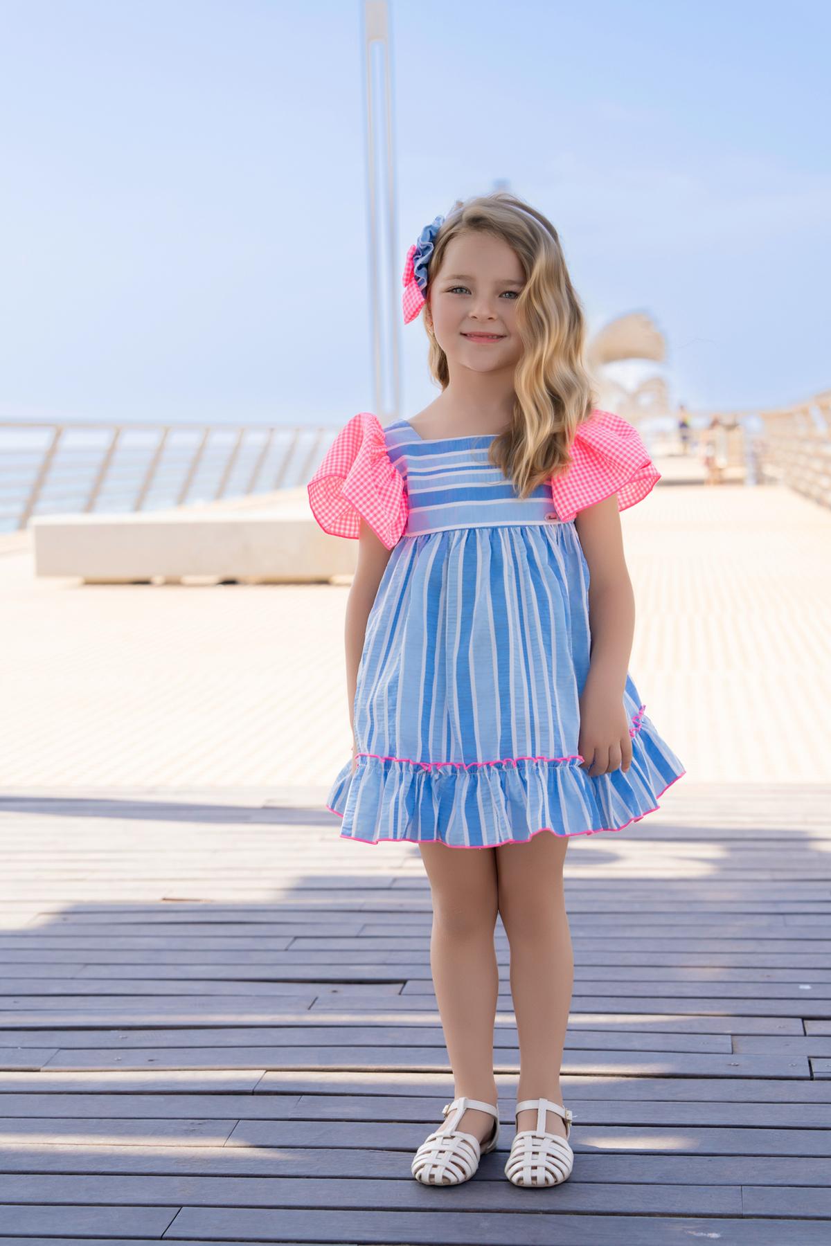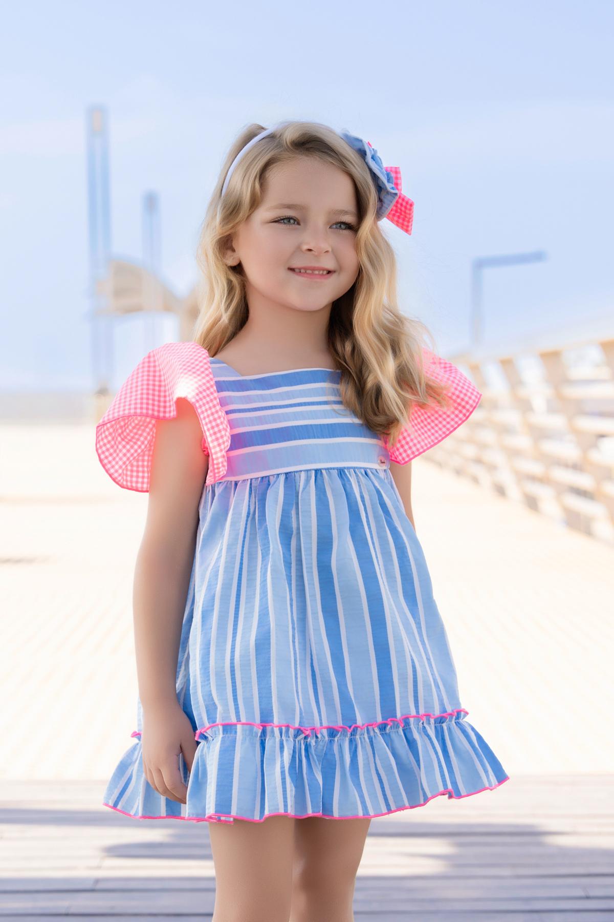 Nuevo vestido de tirantes para niña de la colección de Miranda 2026 para esta primavera verano, modelo 617-V, confeccionado en tejido de rayas en tonos azules y decorado con volantes de cuadros vichy en las mangas y en el lazo de la espalda.