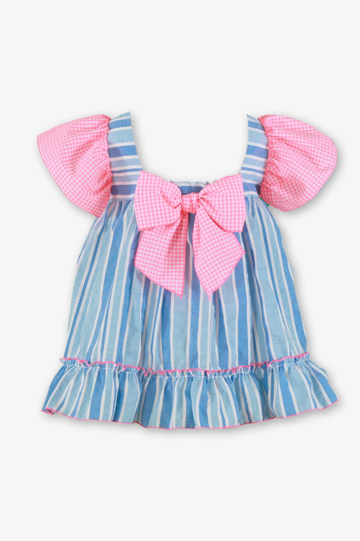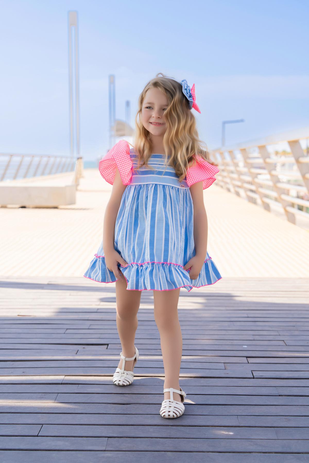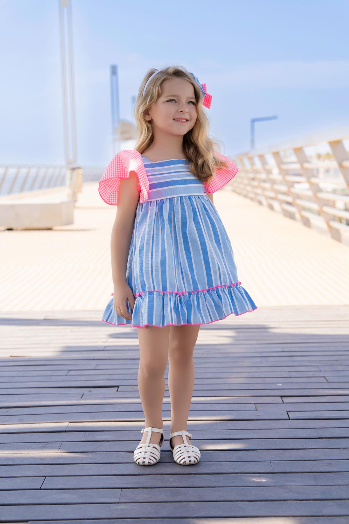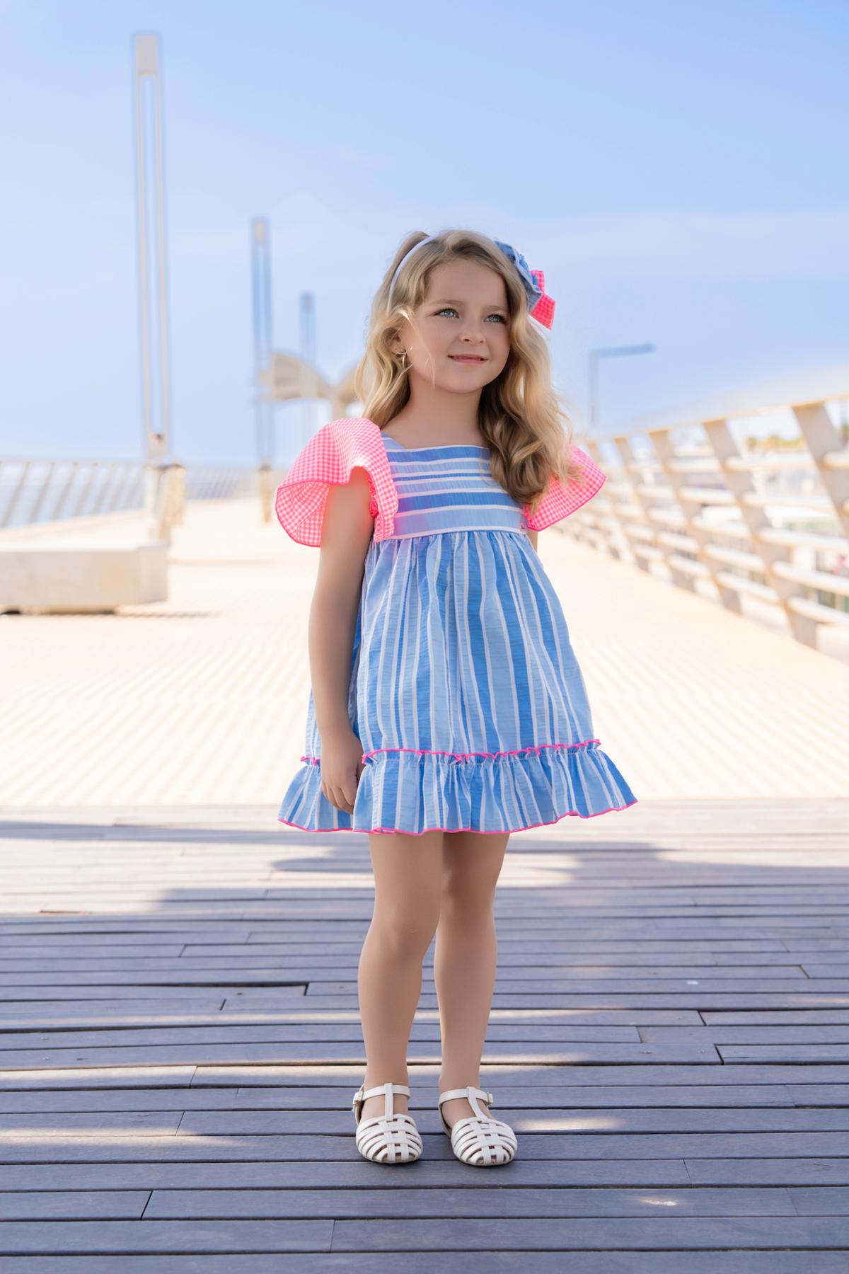 Nuevo vestido de tirantes para niña de la colección de Miranda 2026 para esta primavera verano, modelo 617-V, confeccionado en tejido de rayas en tonos azules y decorado con volantes de cuadros vichy en las mangas y en el lazo de la espalda.